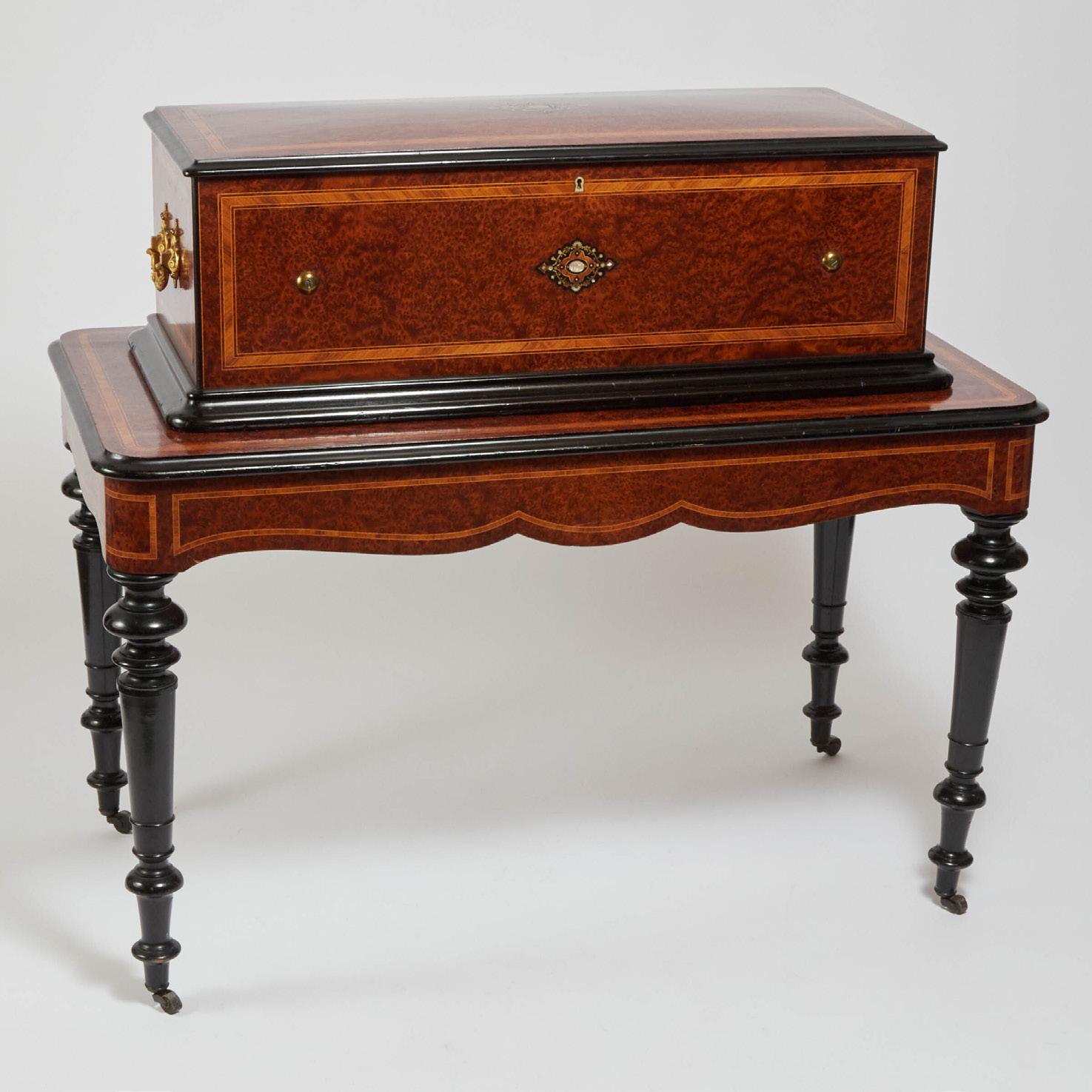LARGE SWISS BURL WALNUT AND EBONISED WOOD MUSIC BOX ON TABLE STAND, C.1890