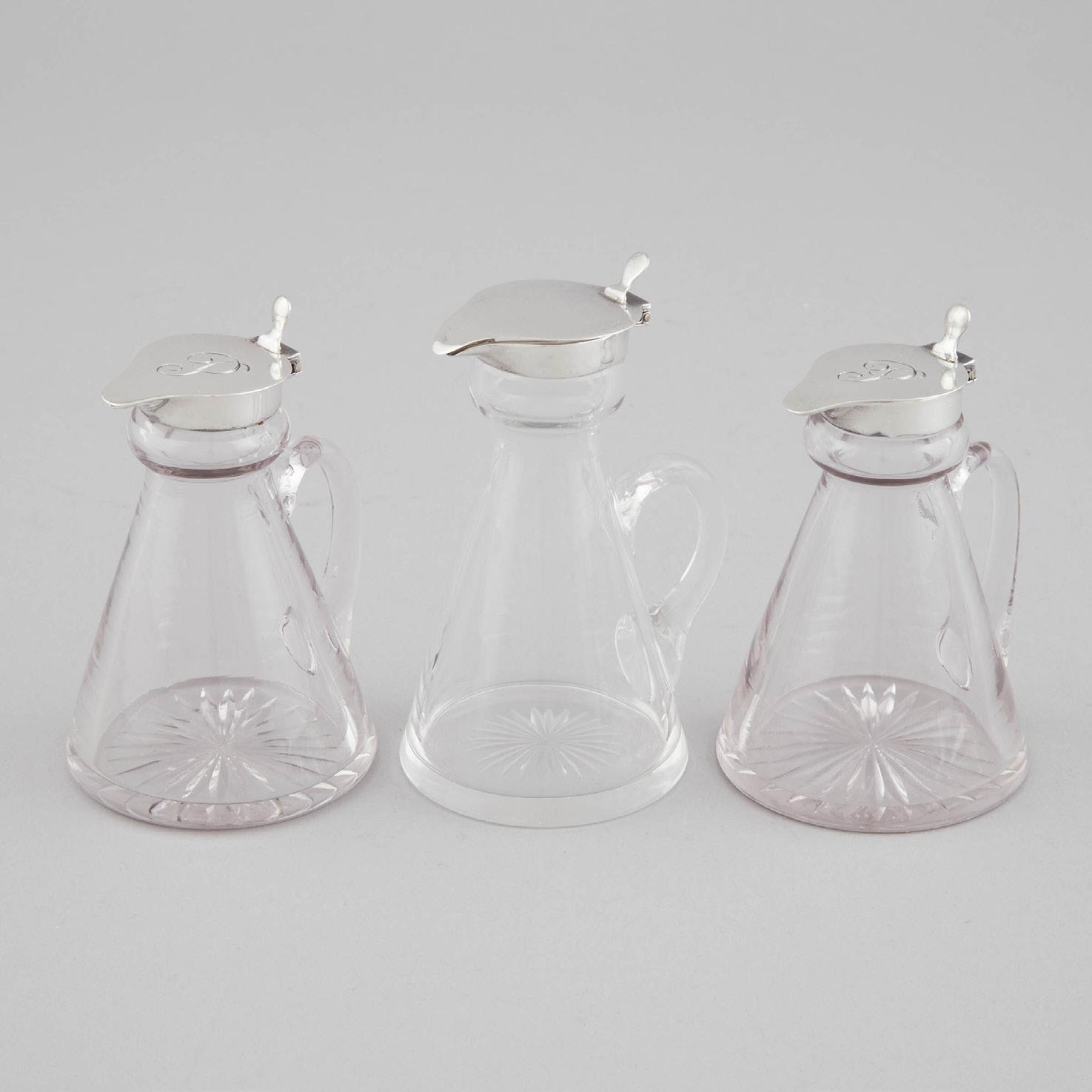 THREE ENGLISH SILVER MOUNTED GLASS WHISKEY TOTS, S. BLANCKENSEE & SONS, 1915/1936