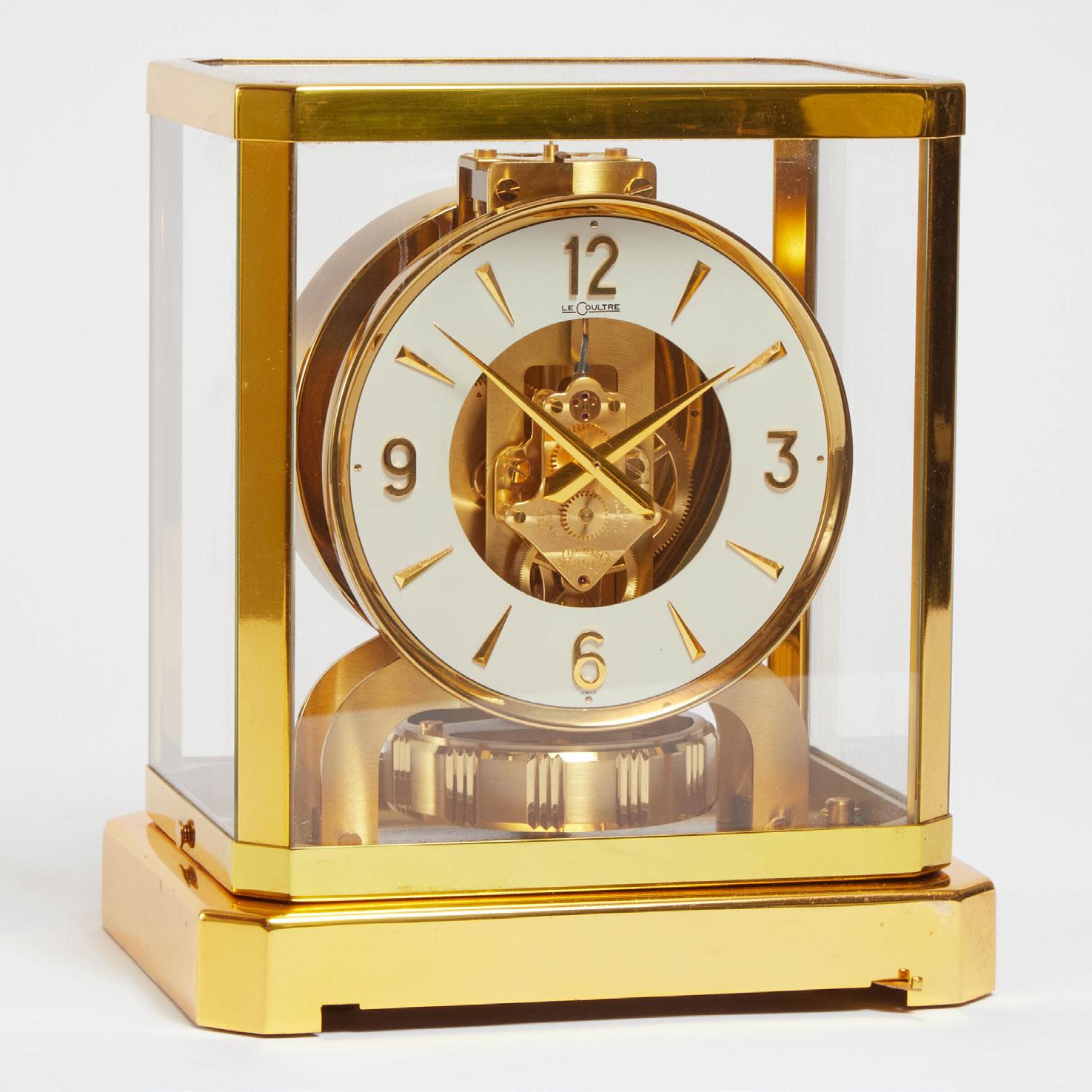 JAEGER LECOULTRE ATMOS CLOCK, 1960 calibre 528-6, serial no. 129017, the signed white enamel chapter ring with Arabic numerals at the quarters and indices between, with original green linen carton, height 9.25 in — 23.5 cm