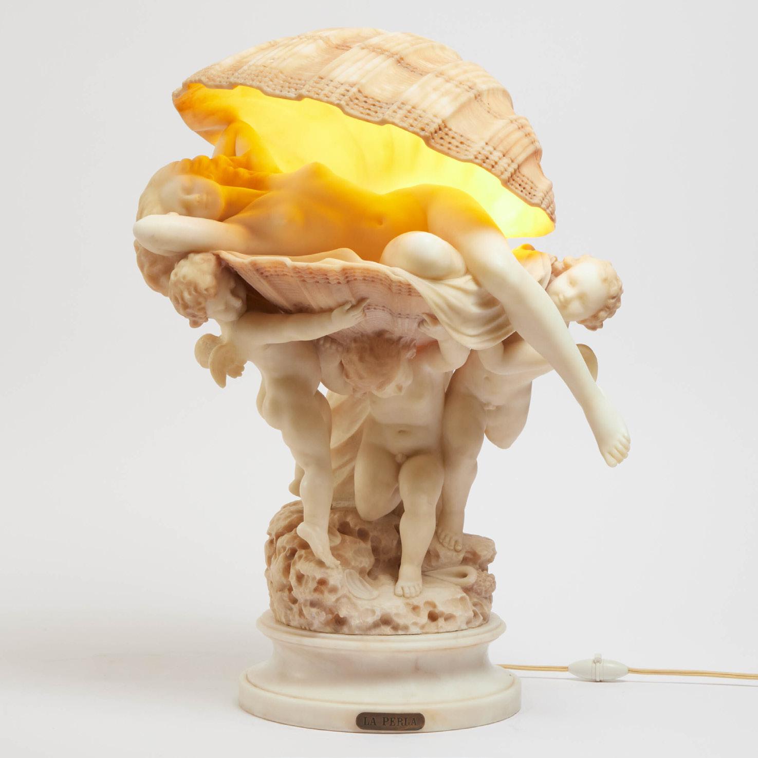 MODELLED AFTER THE ANCIENT AS CLASSICAL ATHLETES, LATE 20TH CENTURY each in the aesthetic of grand tour souvenirs, and on marble a base, with card shade, overall height 31 in — 78.7 cm