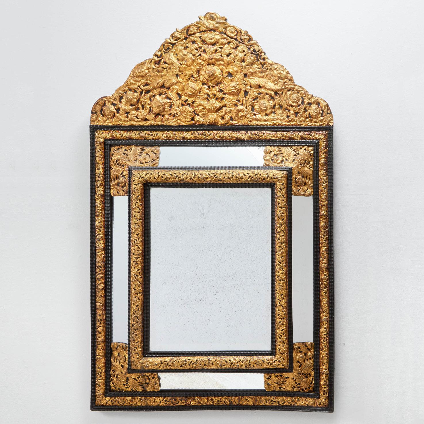BRASS MOUNTED EBONISED PARCLOSE CUSHION MIRROR, 19TH CENTURY the mirror backed crest with a naturalistic pattern of foliated floral vines all over a bevelled rectangular plate in a ripple moulded ebony frame with similar ornamentation, 47.25 x 29 in — 120 x 73.7 cm