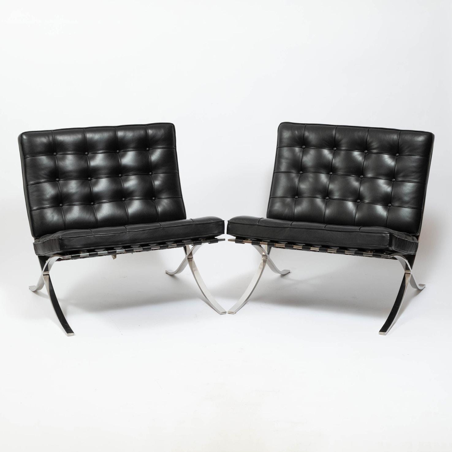 MIES VAN DER ROHE FOR KNOLL, PAIR OF BARCELONA CHAIRS, C.1980 with button tufted black leather upholstery, each 30.25 x 29.5 x 30 in — 76.8 x 74.9 x 76.2 cm
