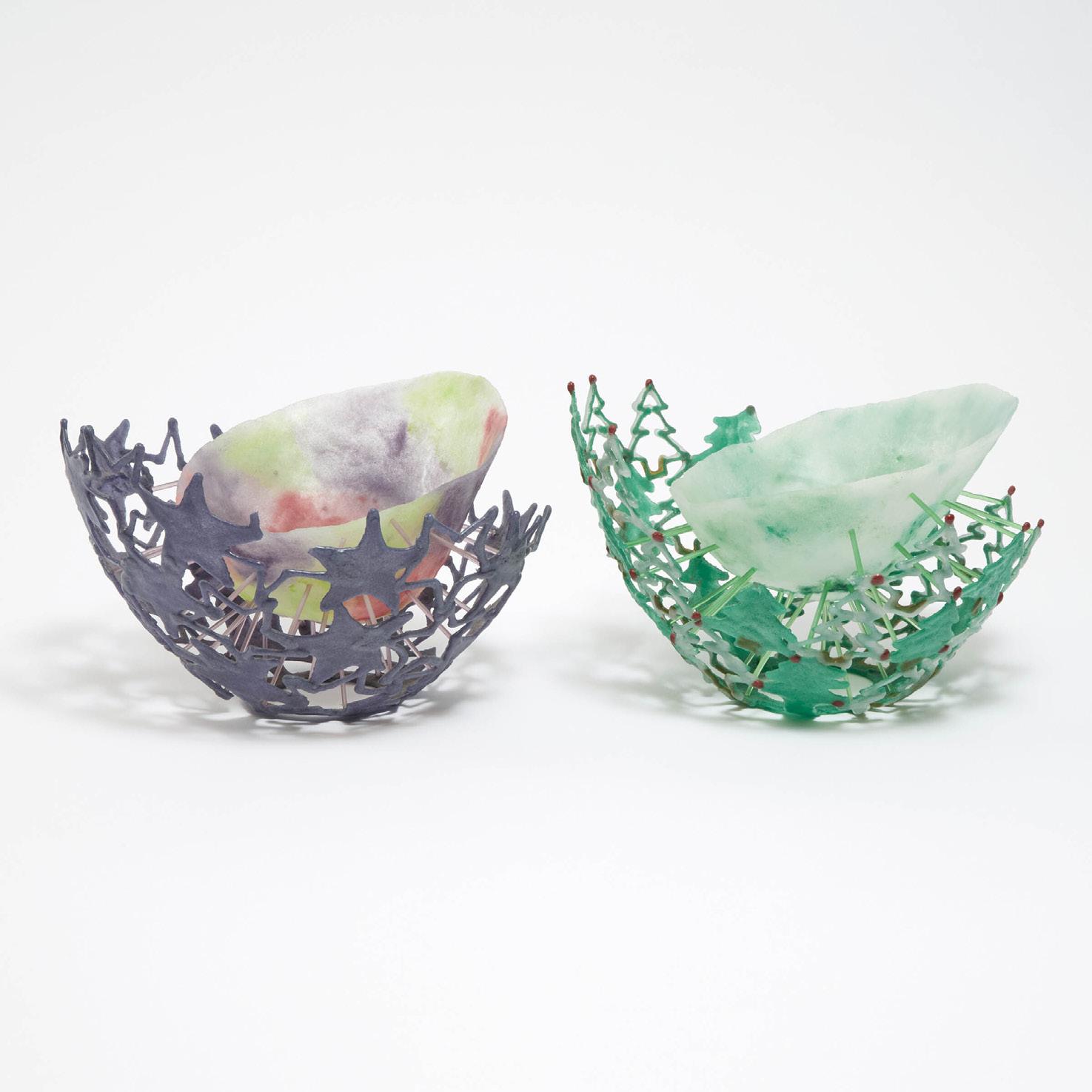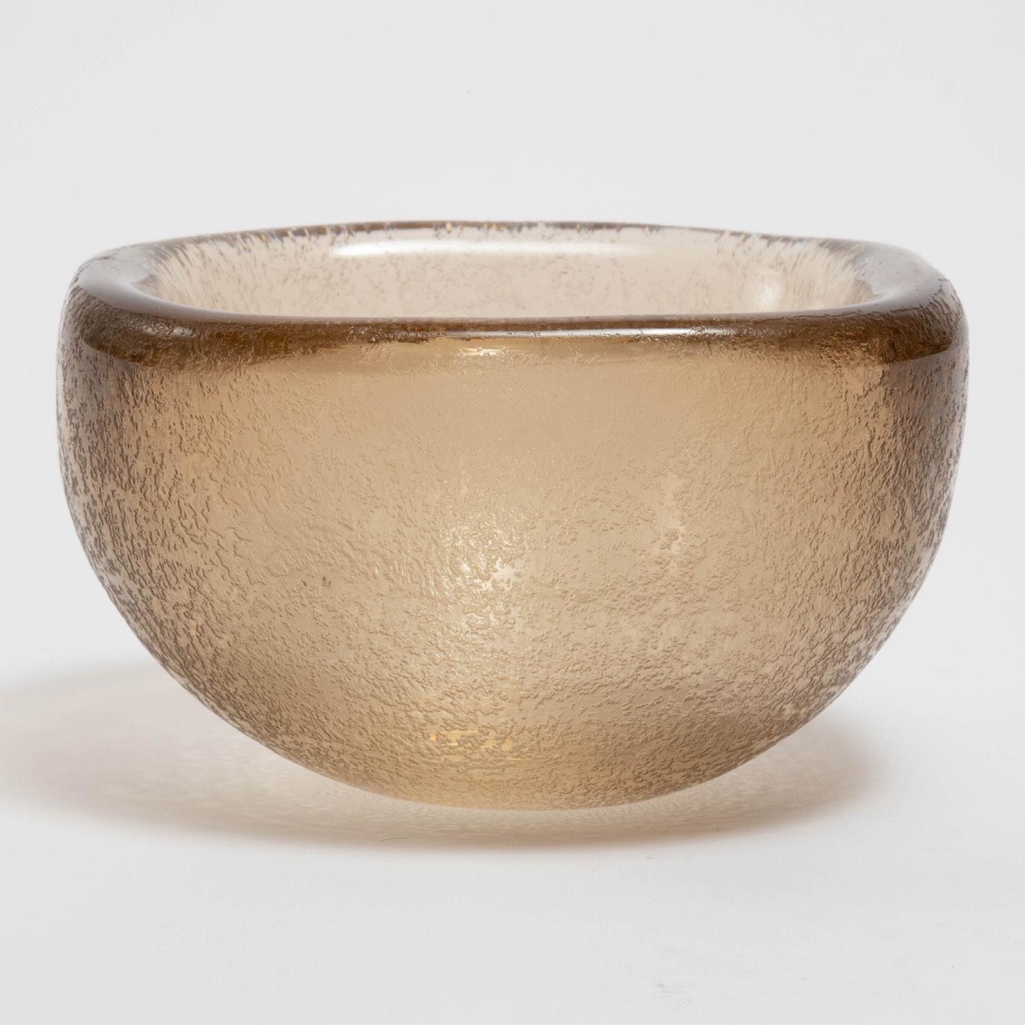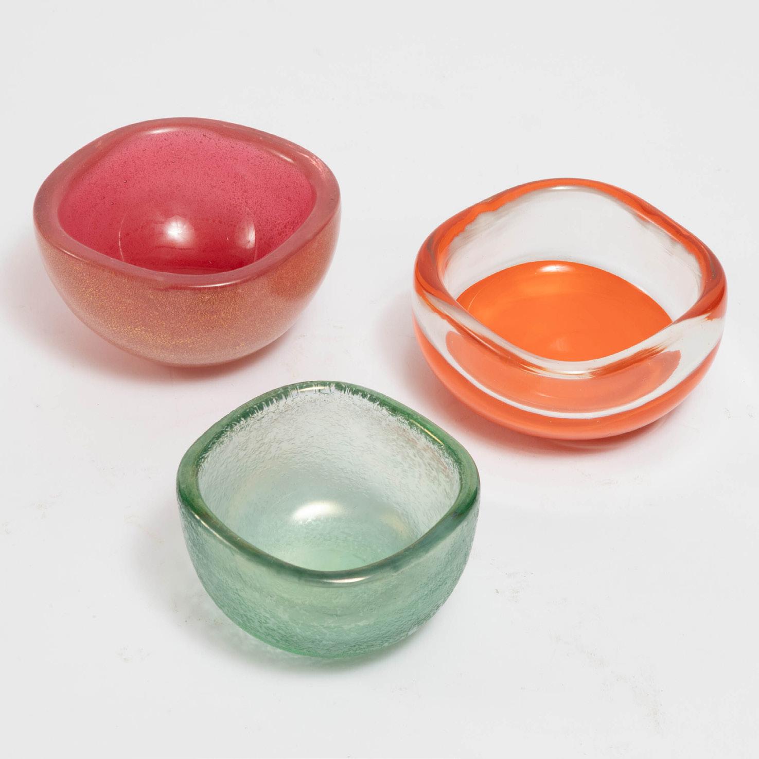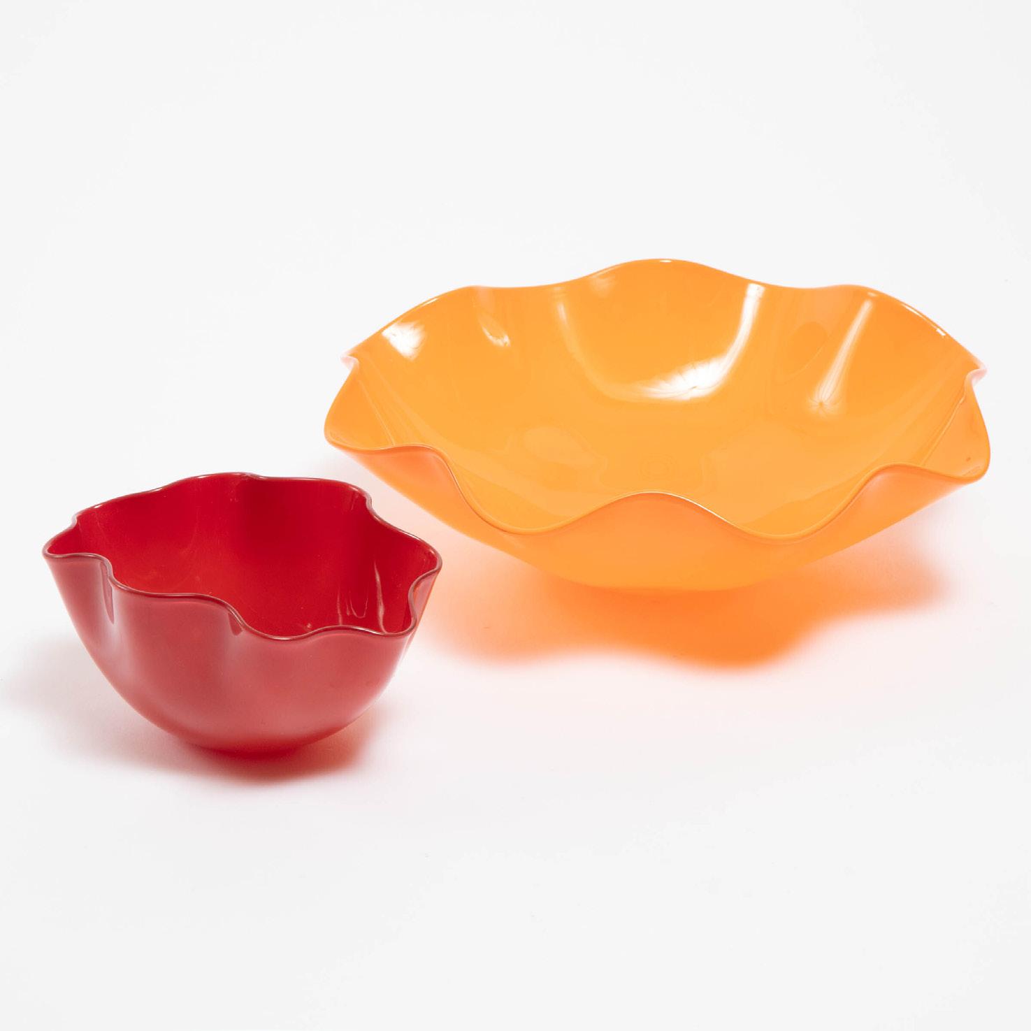 TWO ORREFORS ‘KANTARA’ ORANGE AND RED GLASS BOWLS, SVEN PALMQVIST, MID-20TH CENTURY diameter 9.2 in — 23.3 cm; diameter 5.2 in — 13.2 cm, engraved marks including Orrefors Expo 106 / Sven Palmqvist