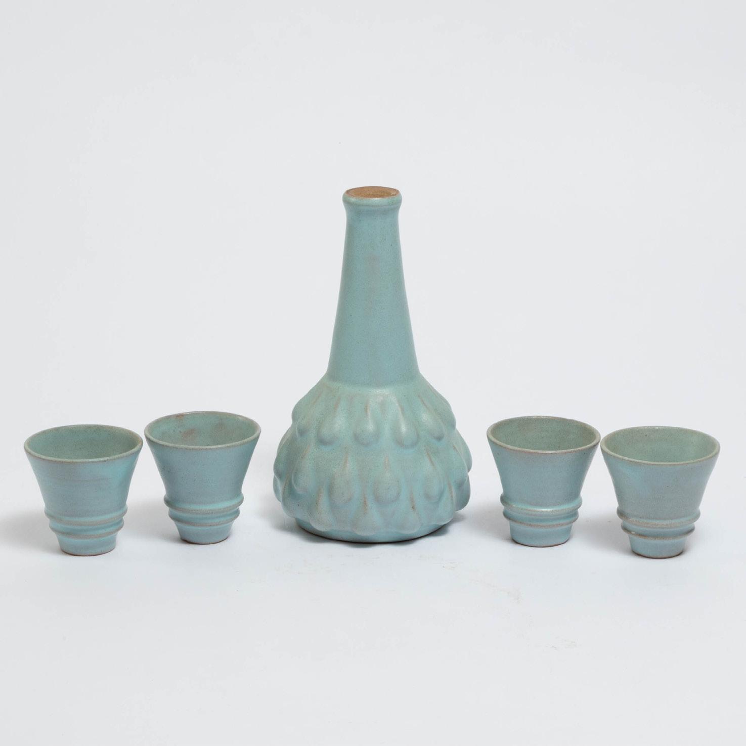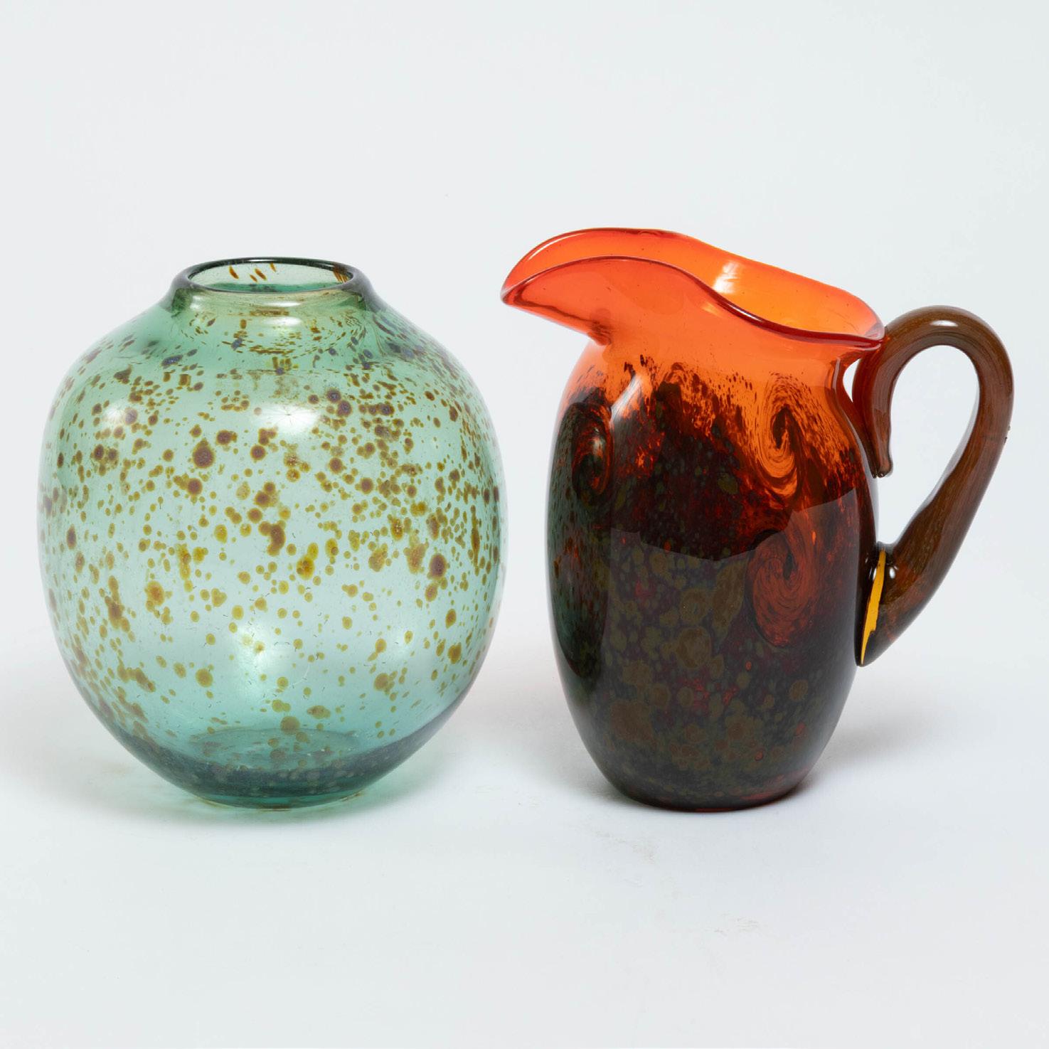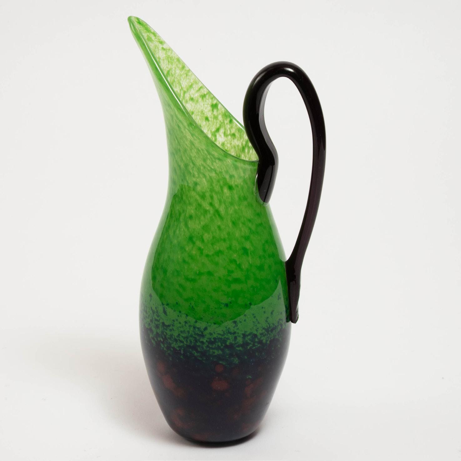 DEGUÉ MOTTLED GREEN BLUE AND RED GLASS JUG, C.1930