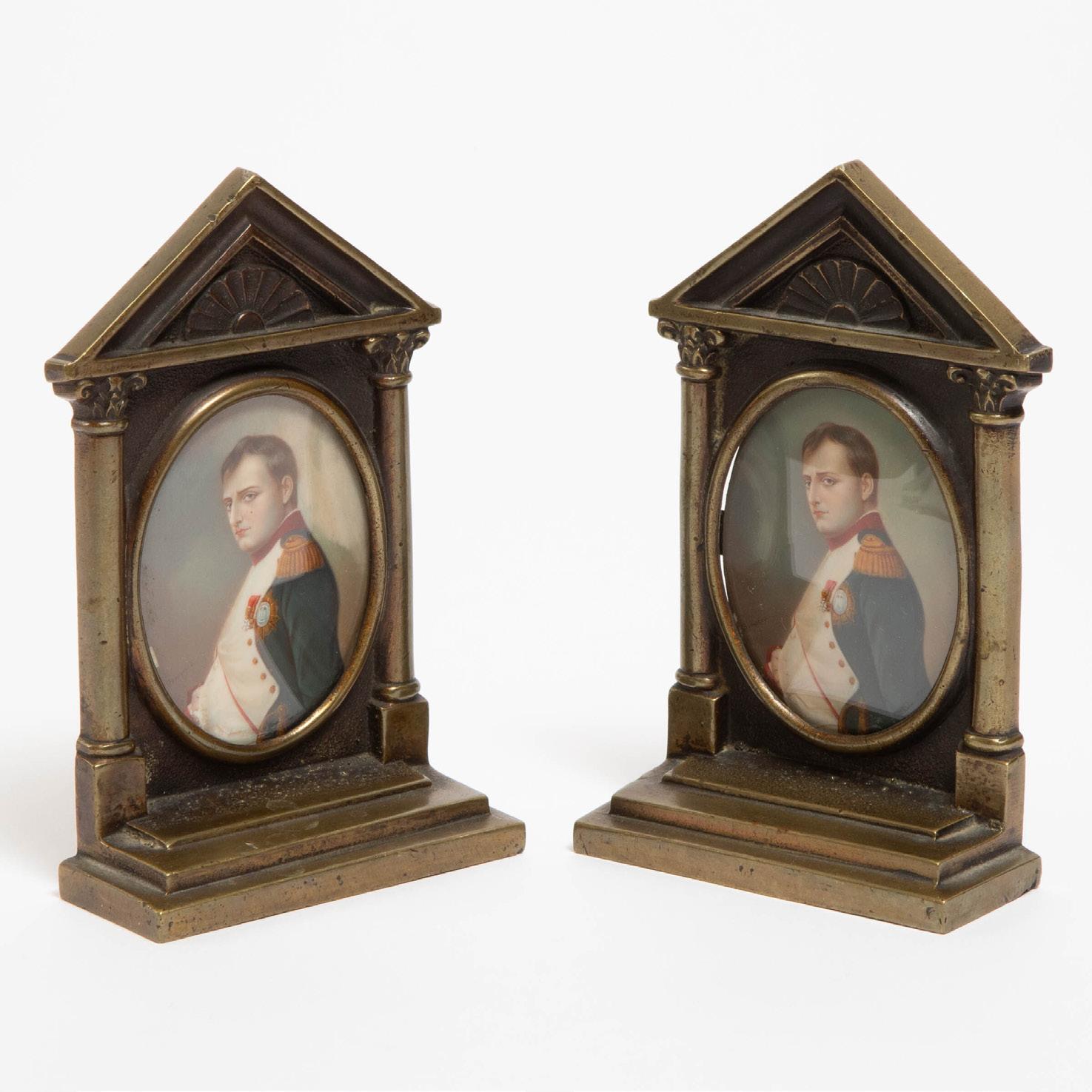 PAIR OF FRENCH NAPOLEON I PORTRAIT BRONZE BOOKENDS, EARLY 20TH CENTURY each set with an unsigned gouache on oval ivory panel, after Hippolyte-Paul Delaroche (French, 1797-1856) of Napoleon I in his study, height 6.3 in — 16 cm