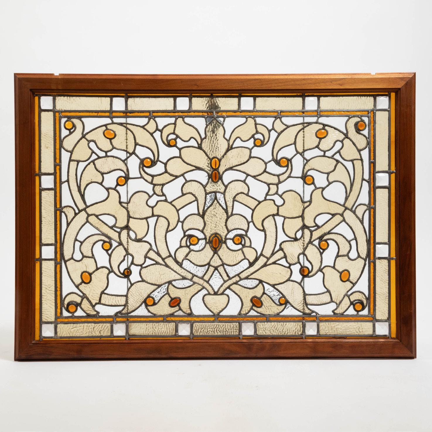 LARGE EDWARDIAN STAINED AND LEADED GLASS WINDOW PANEL, EARLY 20TH CENTURY in original walnut frame, 30.75 x 43 in — 78.1 x 109.2 cm