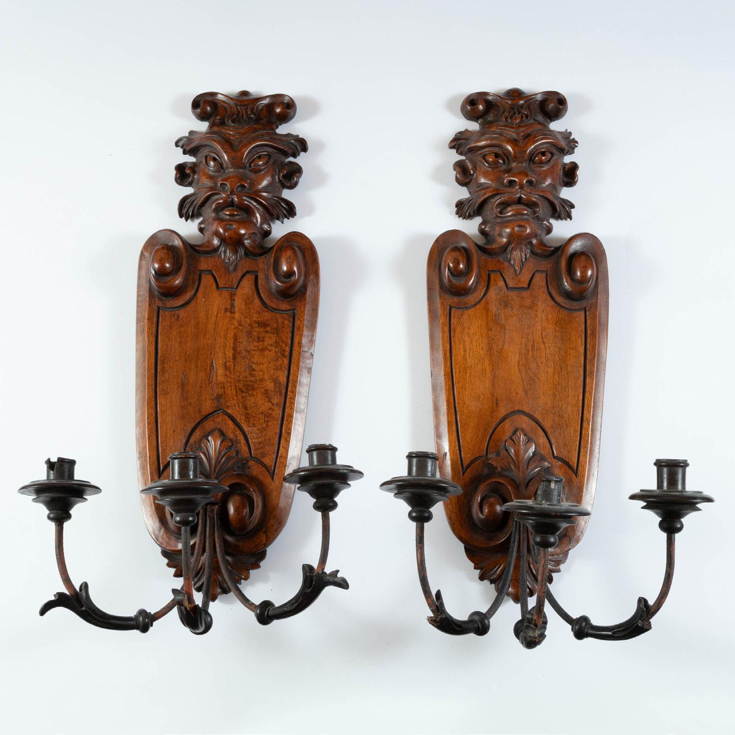 PAIR OF VICTORIAN RENAISSANCE CARVED WALNUT GROTESQUE MASK THREE CANDLE WALL SCONCES, MID-19TH CENTURY