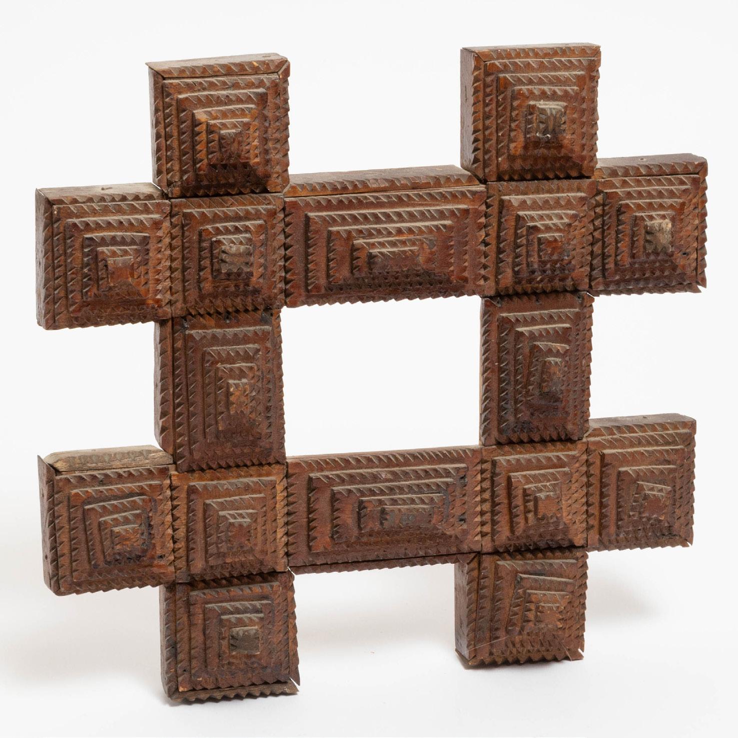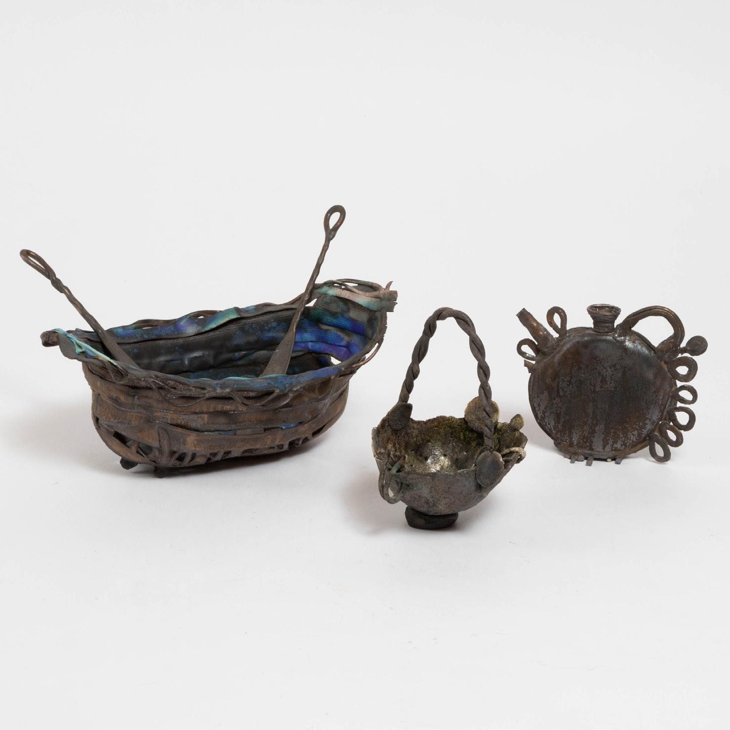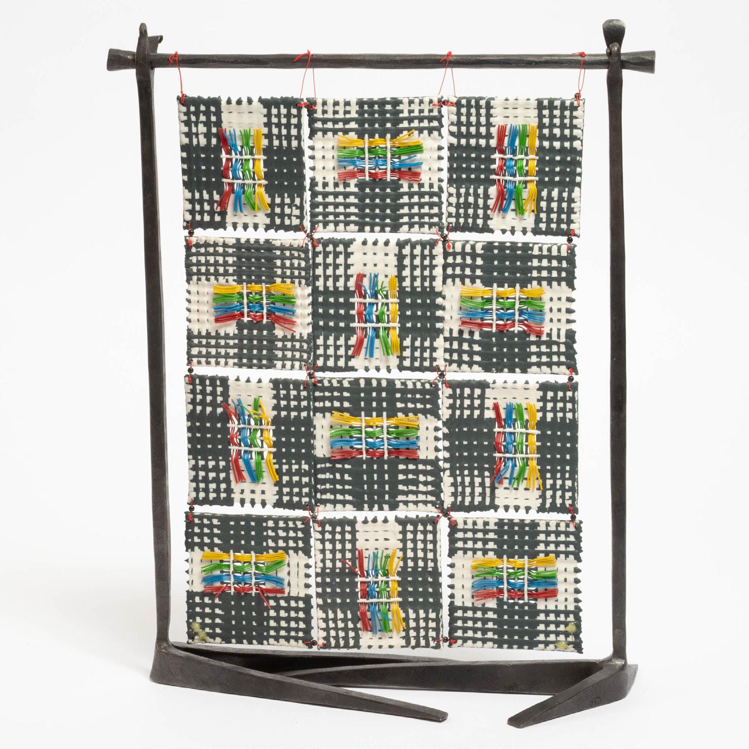 mixed metal (silver, gold) and wood assemblage on acrylic painted board, signed, framed 14 x 18 in — 35.6 x 45.7 cm