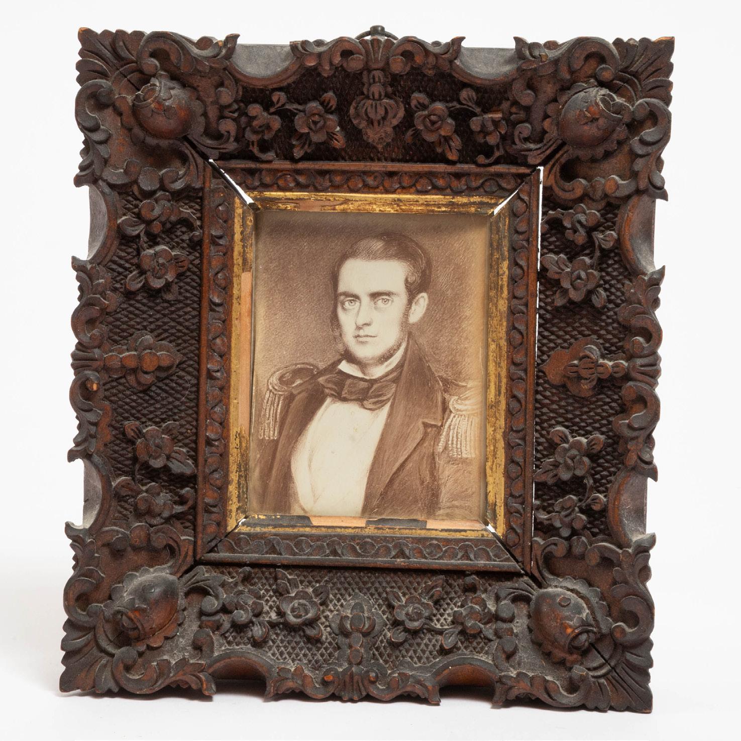 CONTINENTAL SCHOOL PORTRAIT MINIATURE OF A YOUNG NAVAL OFFICER IN AN ORNATELY CARVED WALNUT FRAME, MID-19TH CENTURY frame 9.2 x 8.25 in — 23.4 x 21 cm