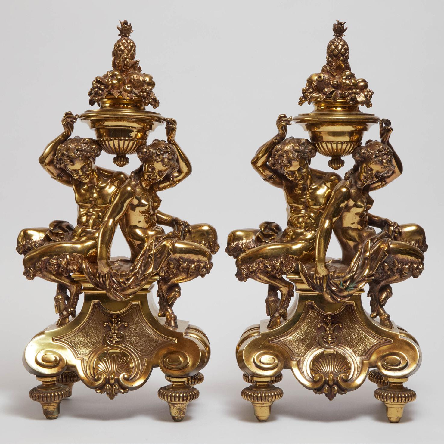 MASSIVE PAIR OF NAPOLEON III DIONYSIAN FIGURAL CHENETS, LATE 19TH CENTURY of polished brass construction, each height 22.75 in — 57.8 cm