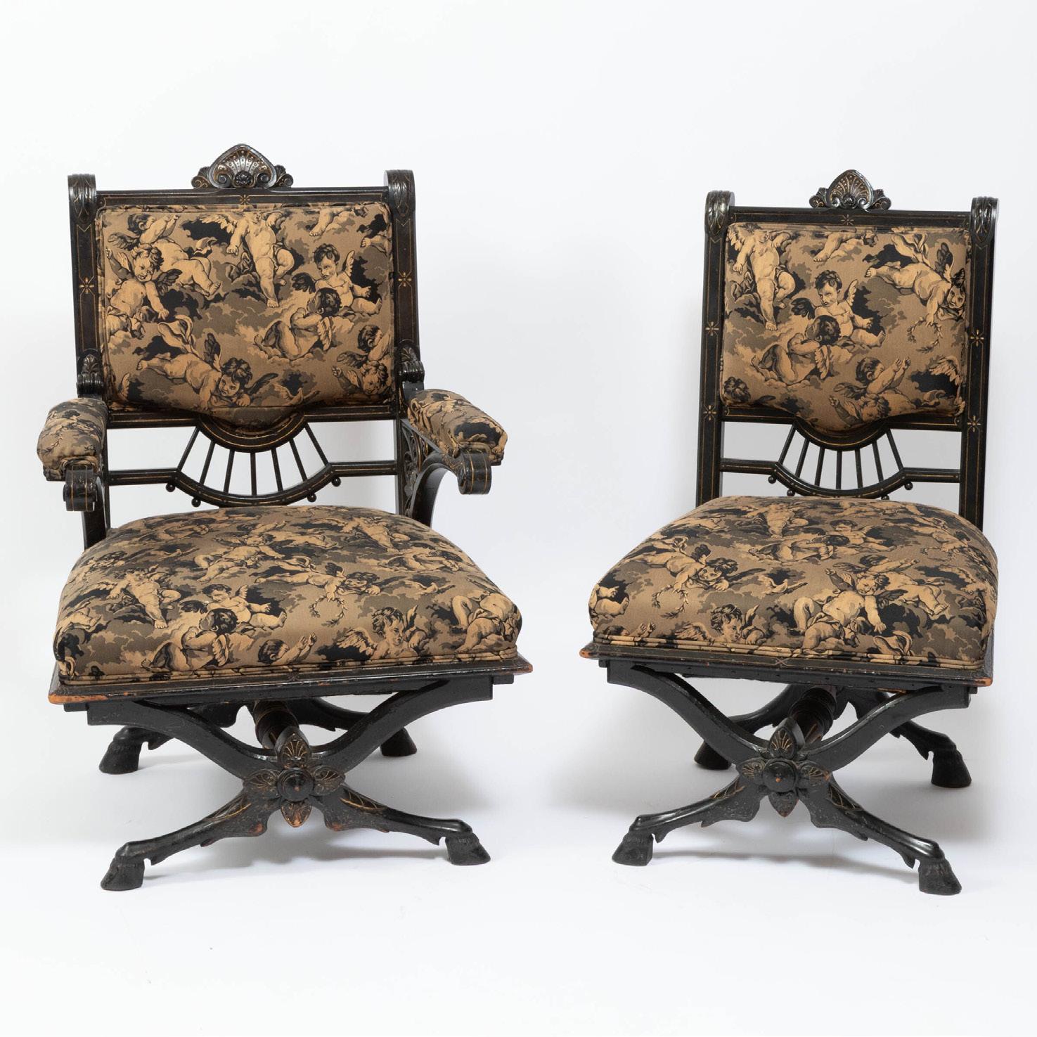 PAIR OF VICTORIAN NEO GREC AESTHETIC EBONISED AND PARCEL GILT PARLOUR CHAIRS, C.1870