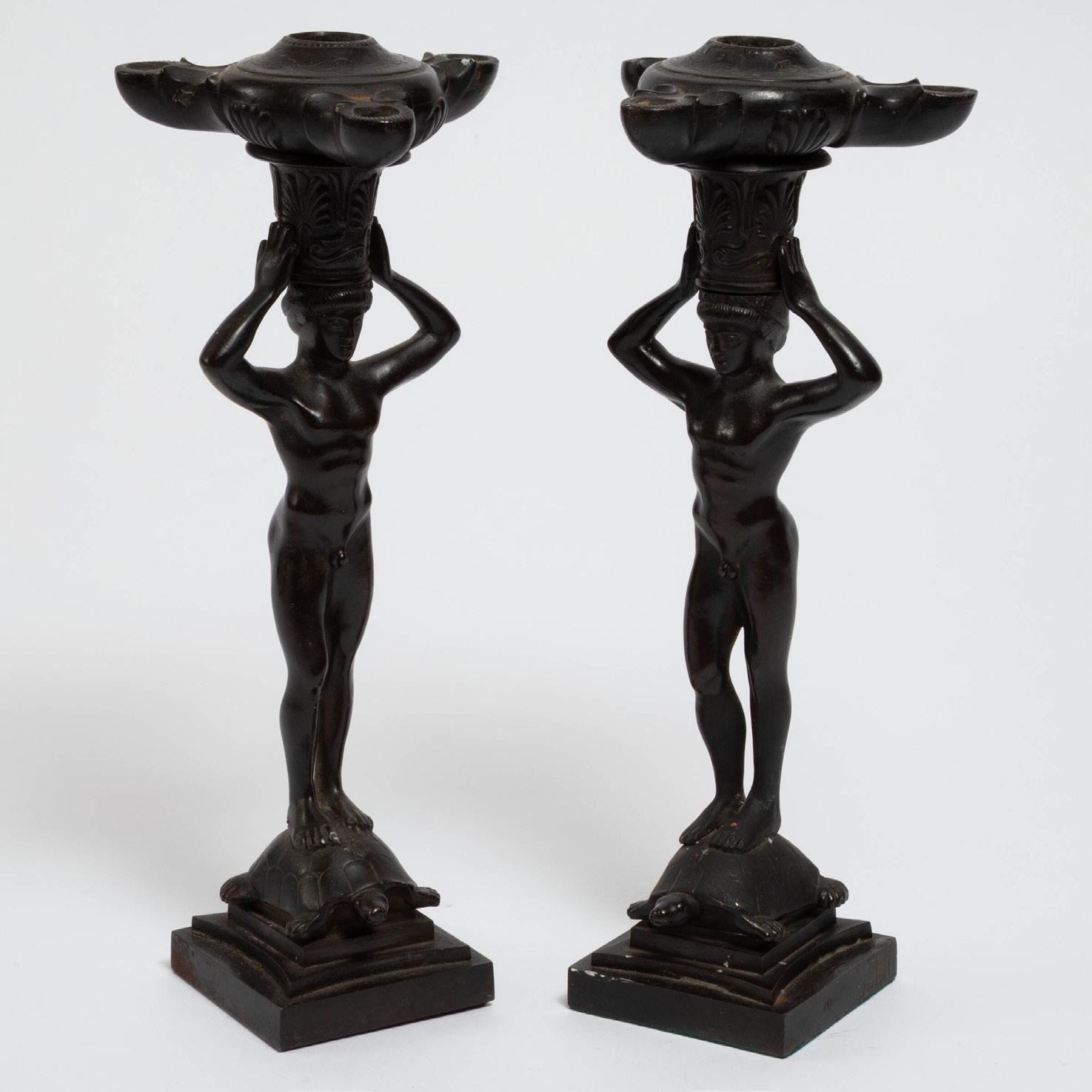 PAIR OF BRONZE ‘ETRUSCAN’ FIGURAL OIL LAMP STICKS, 19TH CENTURY