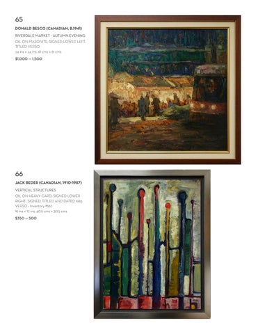 66 JACK BEDER (CANADIAN, 1910-1987) VERTICAL STRUCTURES OIL ON HEAVY CARD; SIGNED LOWER RIGHT; SIGNED, TITLED AND DATED 1965 VERSO - Inventory #667 16 ins x 12 ins; 40.6 cms x 30.5 cms $350 — 500
