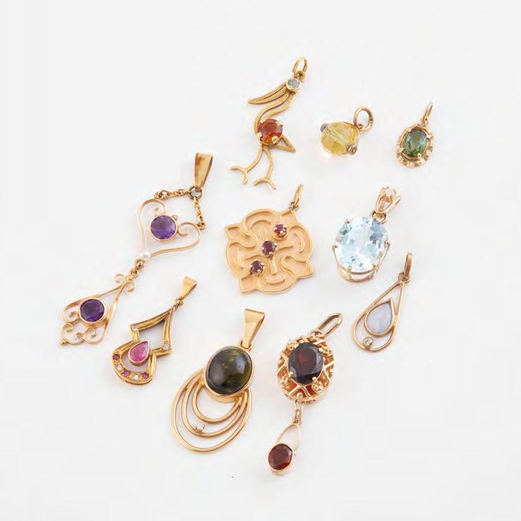 TEN VARIOUS YELLOW GOLD PENDANTS including 2 x 18k, 4 x 14k, 1 x 10k, and 3 x 9k, set with blue topaz, tourmaline, amethyst, citrine, garnet, ruby, garnet, opal, etc., l. of longest 2.3”, 26.1 grams