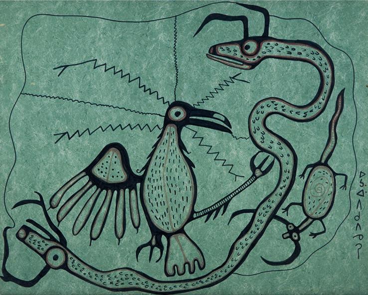 NORVAL MORRISSEAU, CM, RCA (1932-2007), ANISHINAABE (OJIBWE) THUNDERBIRD AND SNAKE MOTIF, 1991 ink on matboard; signed in syllabics lower right; titled and dated to gallery label verso sight 31 x 39 in — 78.7 x 99.1 cm