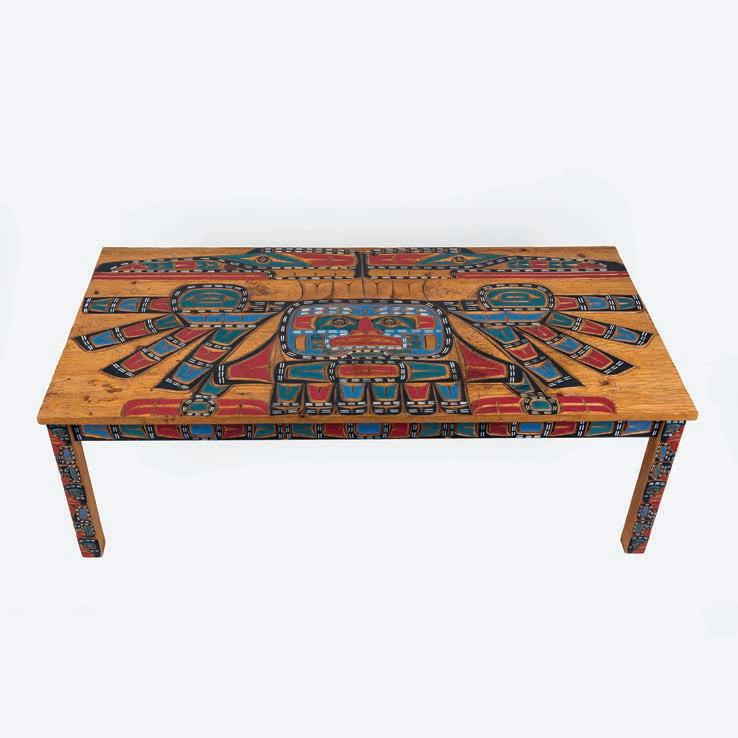 A CARVED AND PAINTED NORTHWEST COAST TABLE WITH DOUBLE RAVEN DESIGN