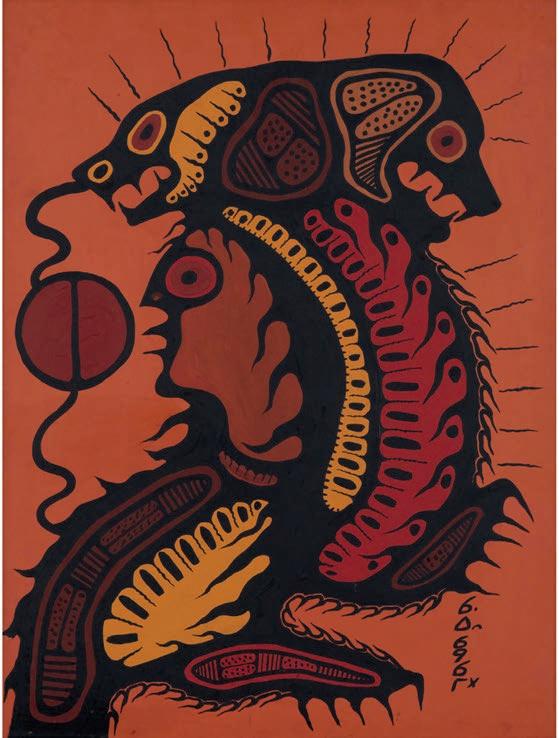 NORVAL MORRISSEAU, CM, RCA (1932-2007), ANISHINAABE (OJIBWE) FAMILY TOTEM, CA. 1960-64 acrylic on watercolour paper; signed in syllabics lower left; titled and dated to gallery label verso sheet 30 x 21.75 in — 76.2 x 55.2 cm