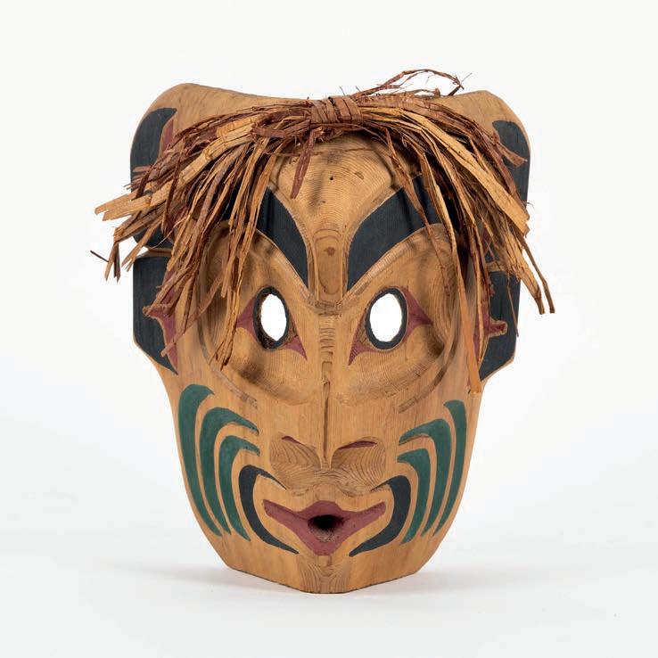 PATRICK AMOS (B. 1957), NUU-CHAH-NULTH MASK PORTRAIT, 1995 red cedar paint, twine, horse hair; signed, titled, and dated verso not including hair 5.5 x 8 x 3.5 in — 14 x 20.3 x 8.9 cm