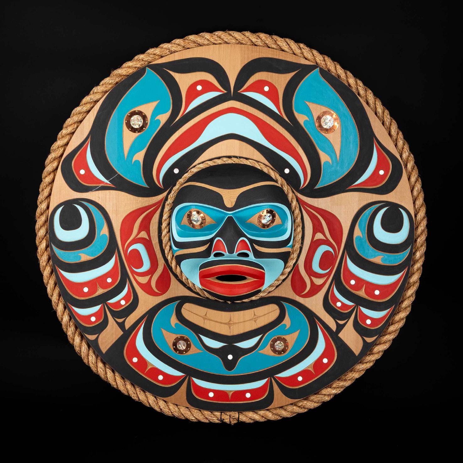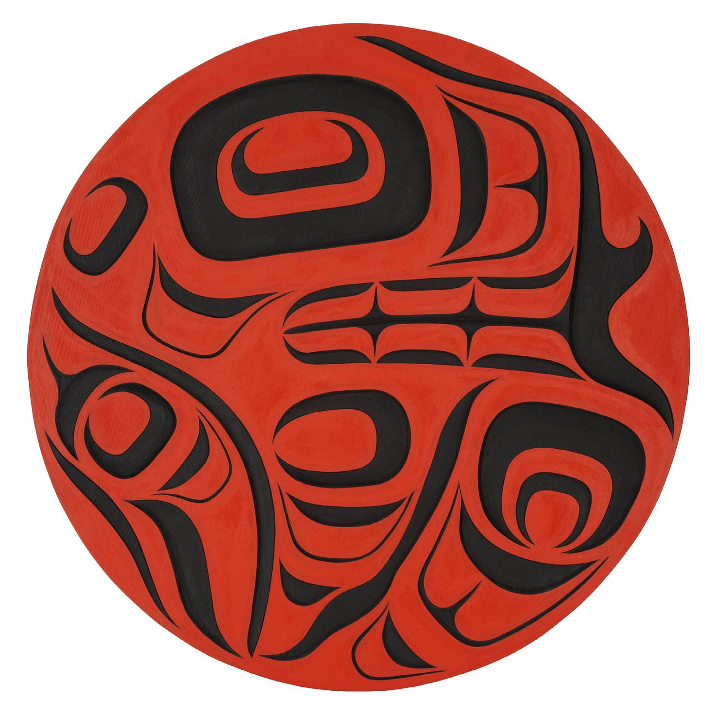 KWAKUITL KILLER WHALE PANEL, 2023 wood, paint; signed, titled, and dated verso diameter 34.5 in — 87.6 cm