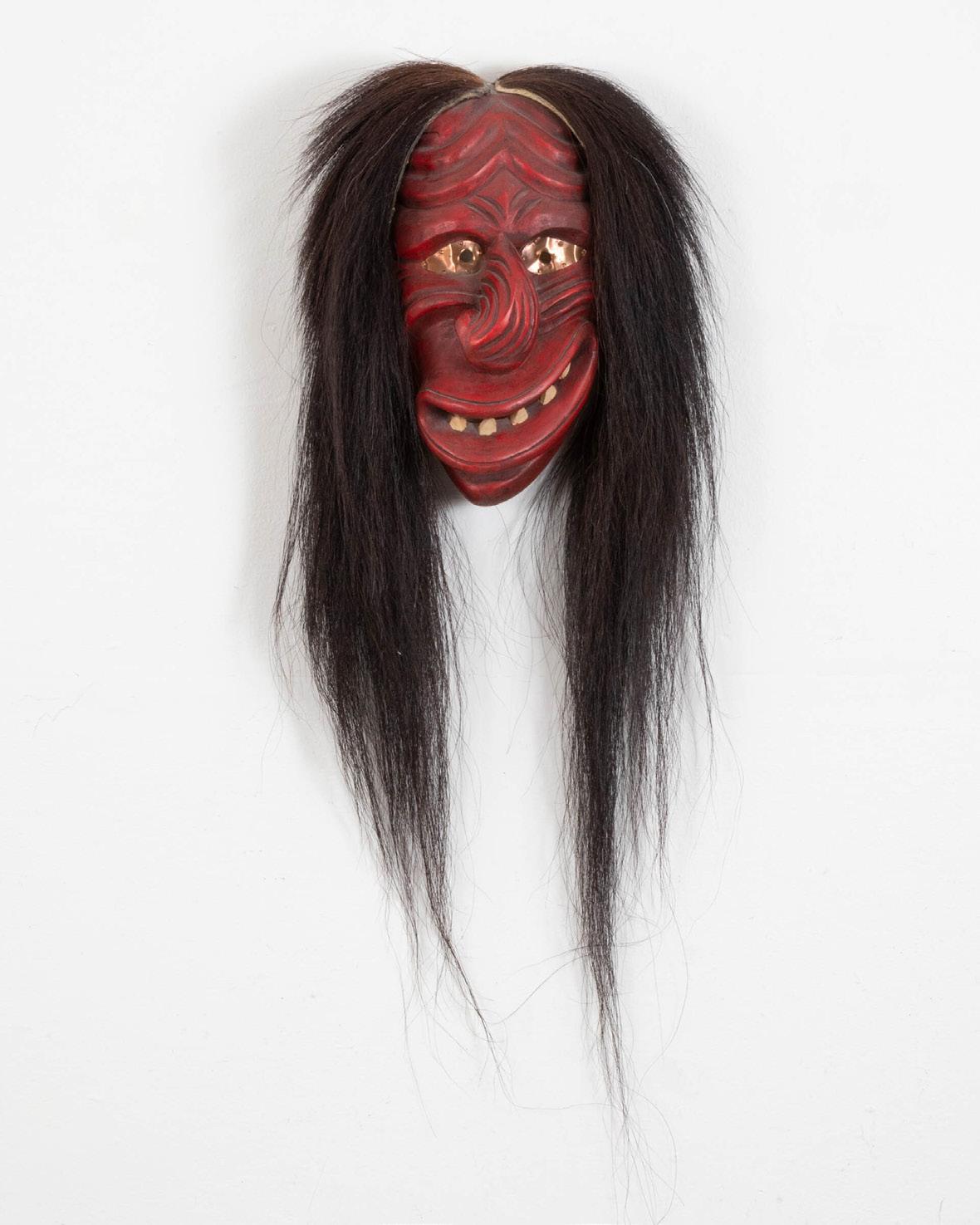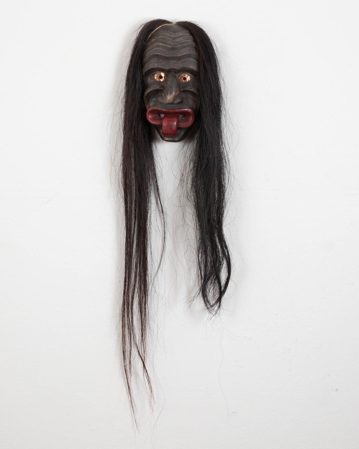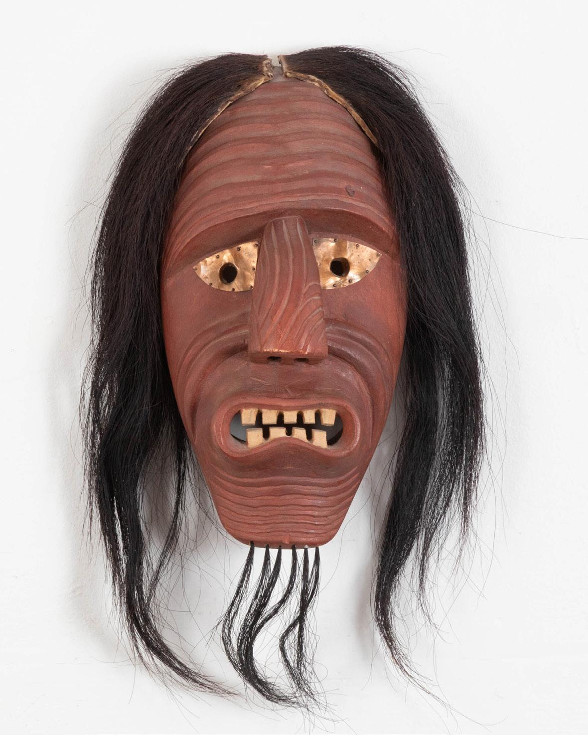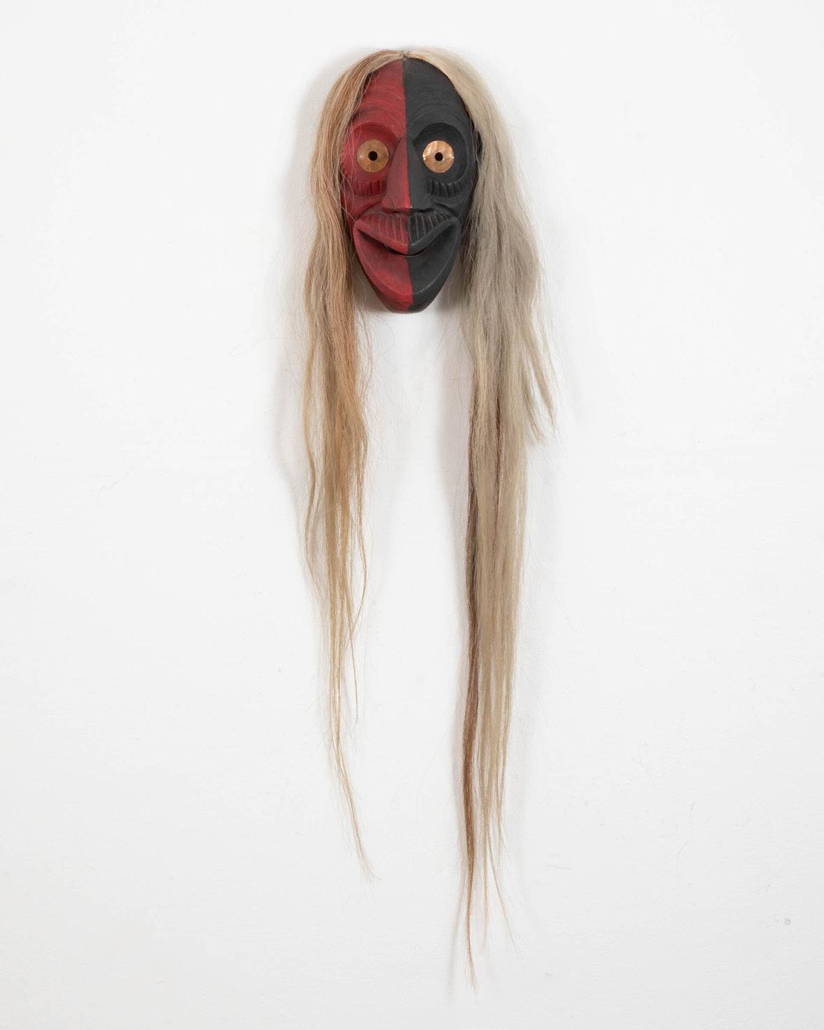 wood, paint, rope, horsehair; unsigned; plaque inscribed “thunderbird mask / strength courage / Wade Baker”