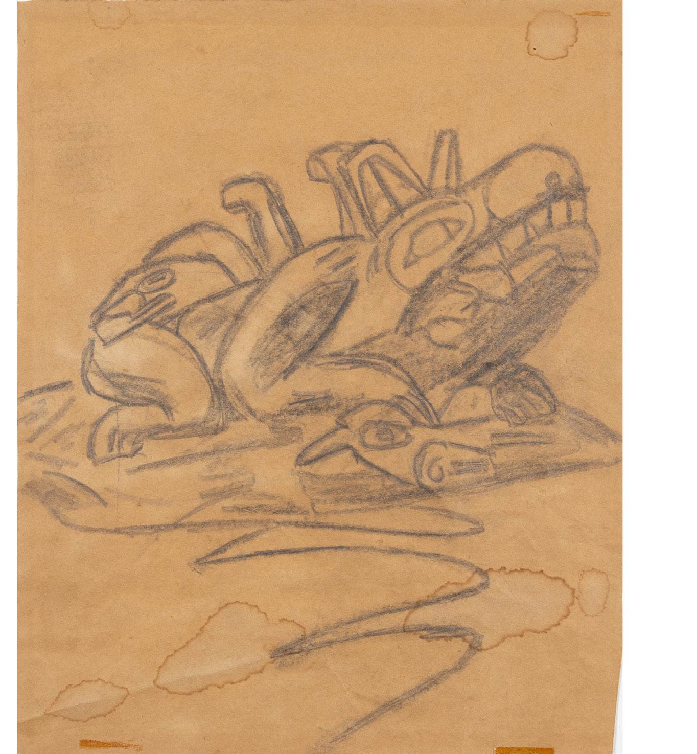 graphite on paper; no visible signature; inscribed with note verso “This sketch of Killer Whale was done by Doug Cranmer, Kwagulth (Kwakiutl) Pt. McNeil/Victoria / Not signed but given to Peggy Martin & Sue for Display in Heritage House Gallery of Indian Art in 1980. Gallery was in Royal Centre at Burrard & Georgia. (Note gallery operated by Sue D. + Peggy M. apx 1978 to closed late 1982)”