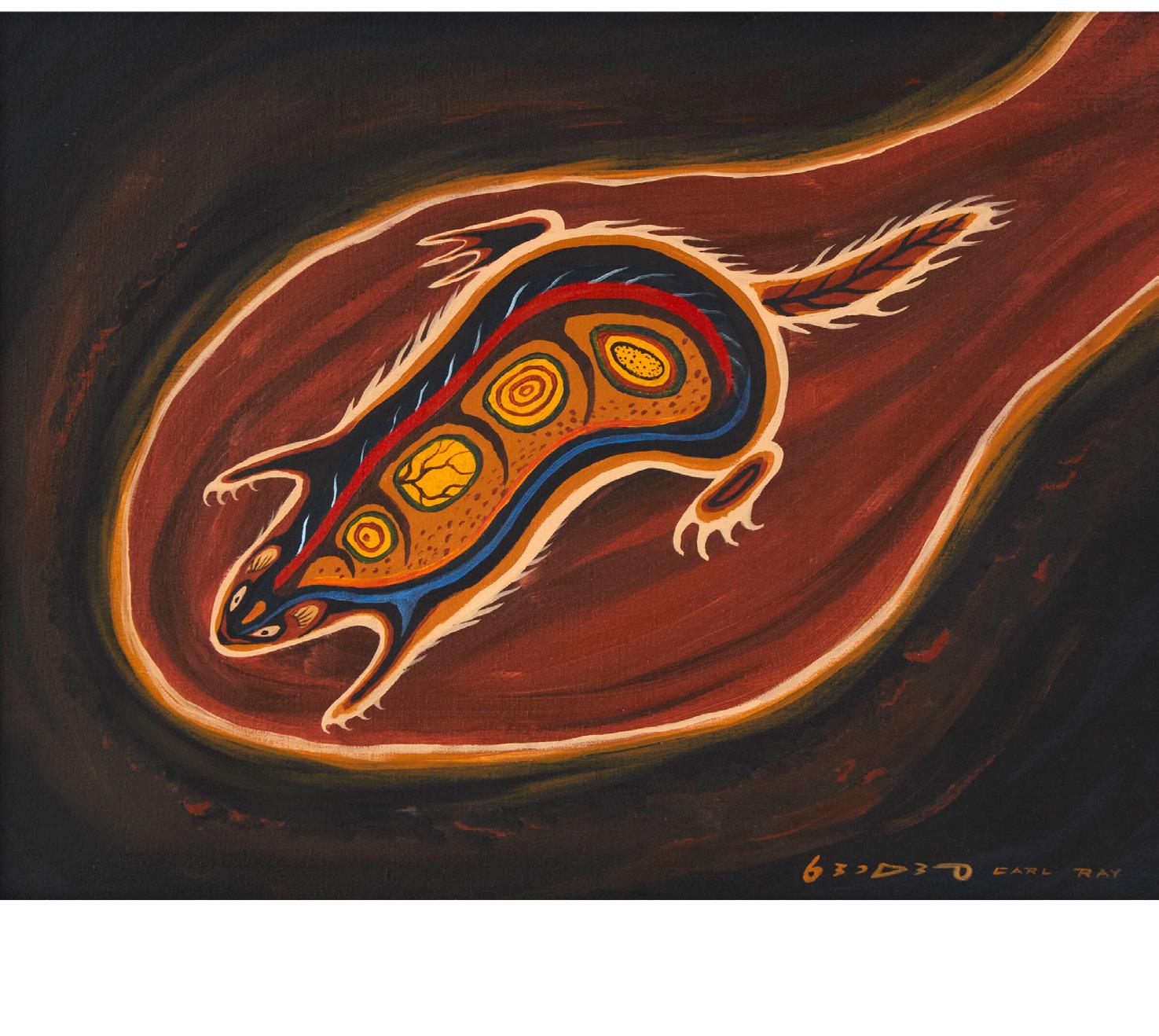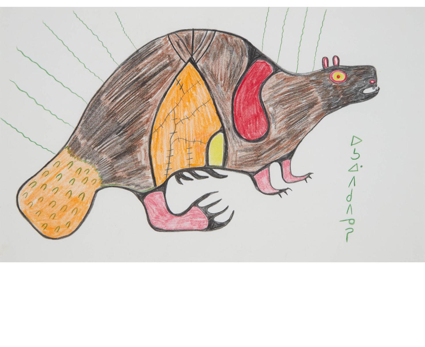 UNTITLED (BURROWING MUSKRAT OR OTTER) acrylic on board; signed in Roman and syllabics lower right sight 17.25 x 23 in — 43.8 x 58.4 cm