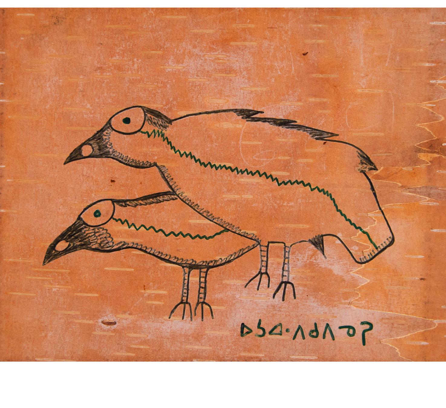 NORVAL MORRISSEAU, CM, RCA (1932-2007), ANISHINAABE (OJIBWE) TWINS, CA . 1966 ink on birchbark; signed lower right; titled and dated to gallery label verso
