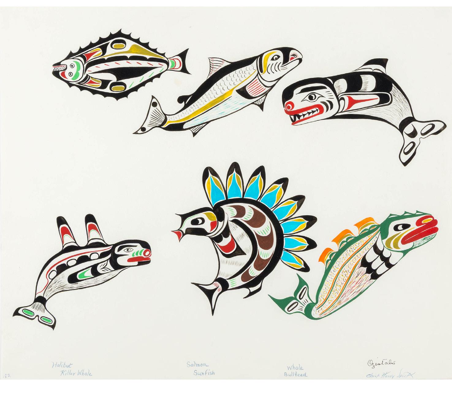 CHIEF HENRY SPECK SR. (OZISTALIS) (1908-1971), KWAKWAKA’WAKW HALIBUT, SALMON, WHALE, KILLER WHALE, SUN FISH, BULLHEAD watercolour on paper; signed and titled sheet 14 x 16.75 in — 35.6 x 42.5 cm