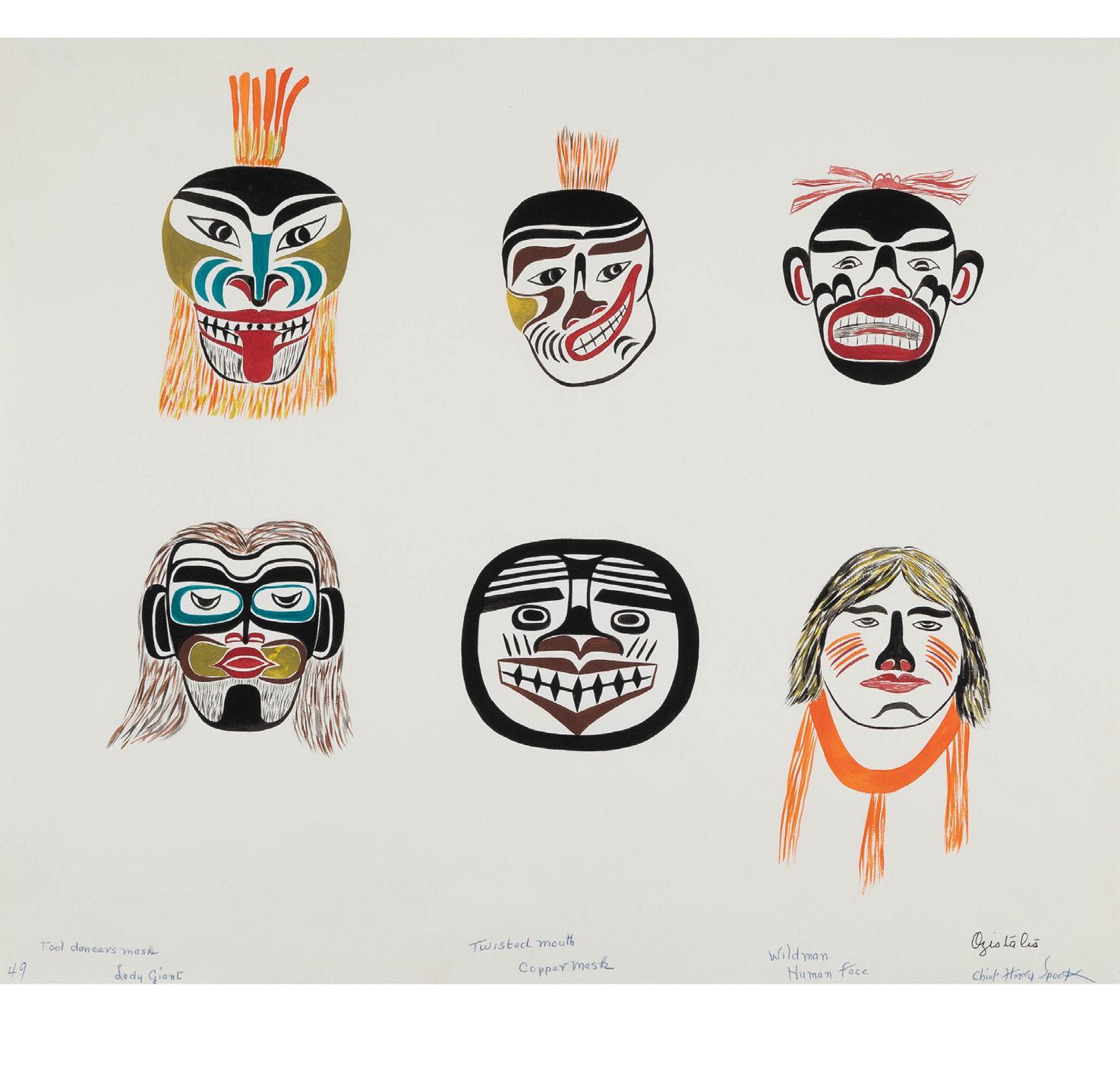 CHIEF HENRY SPECK SR. (OZISTALIS) (1908-1971), KWAKWAKA’WAKW FOOL DANCERS MASK, LADY GIANT, TWISTED MOUTH, COPPER MASK, WILD MAN, AND HUMAN FACE watercolour on paper; signed and titled sheet 14 x 16.75 in — 35.6 x 42.5 cm