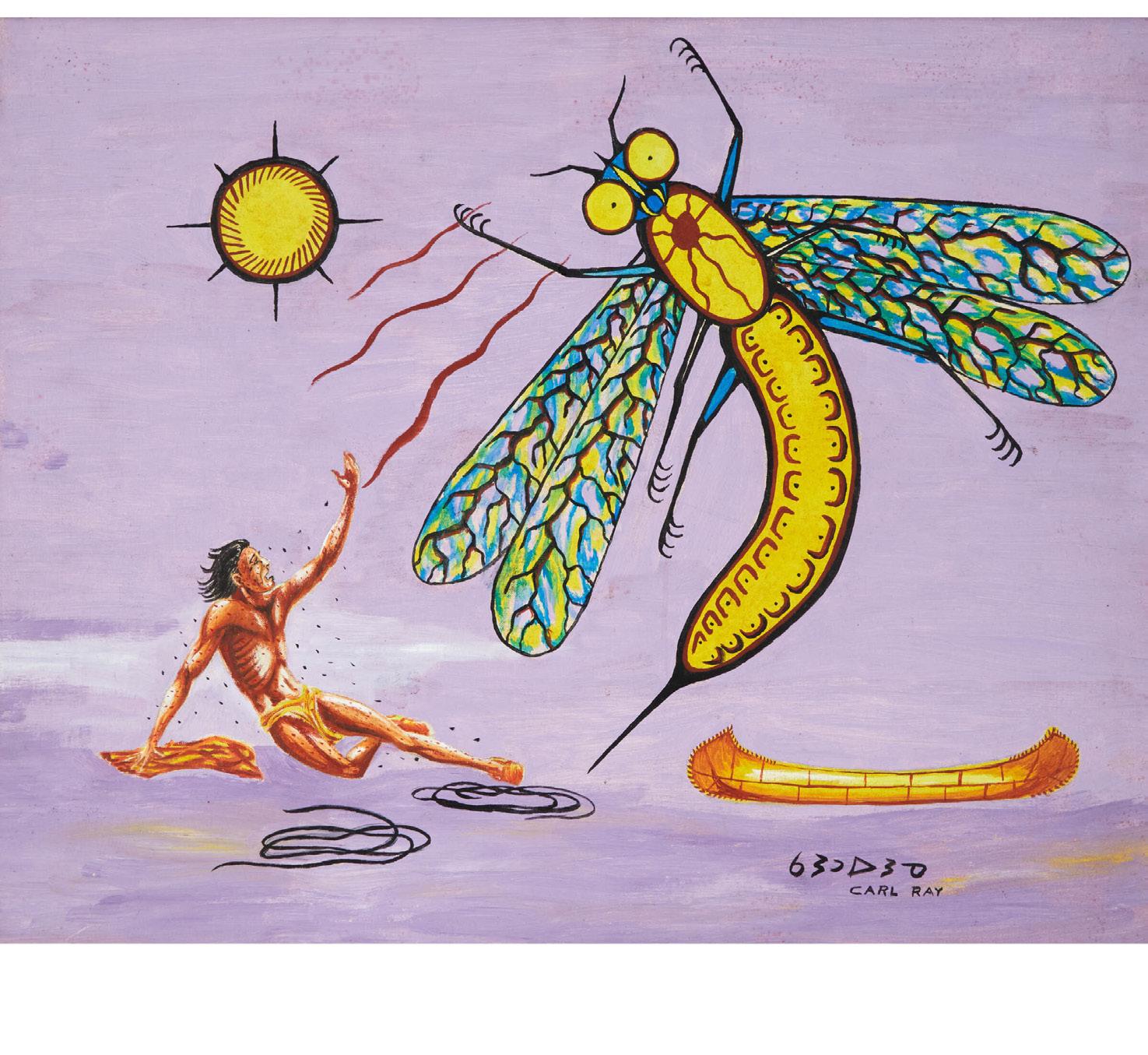 LEGEND OF THE GREAT MOSQUITO acrylic on board; signed in Roman and syllabics lower right; titled verso; inscription of the legend verso