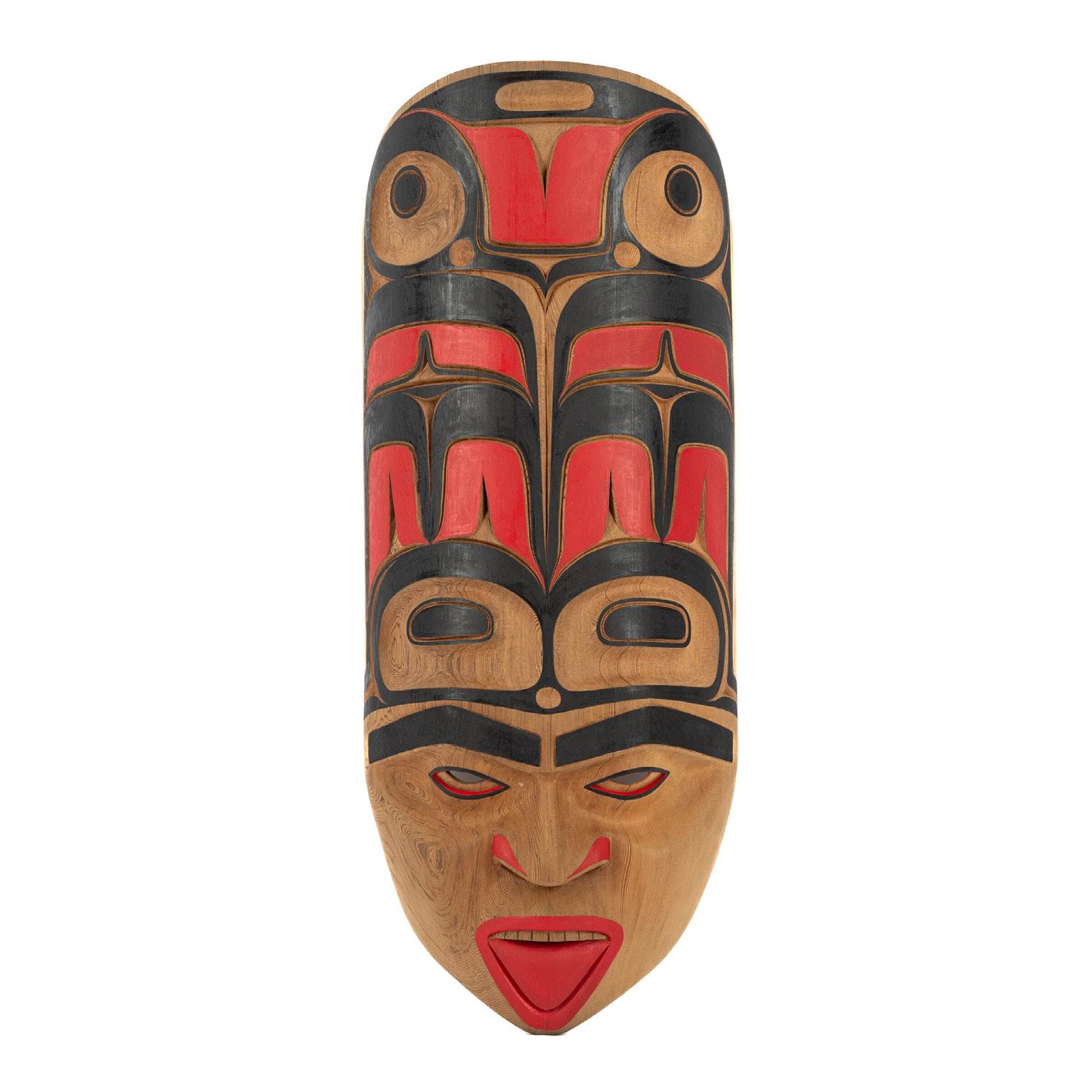 KOLTEN KHASALUS GRANT (B. 1992), KWAKWAKA’WAKW, TLINGIT, SALISH “PAKSAM” WOODBUG MASK, 2021 wood, paint; signed, titled, and dated verso; also inscribed “cleaner of negative energy” 26 x 10.5 x 3.5 in — 66 x 26.7 x 8.9 cm