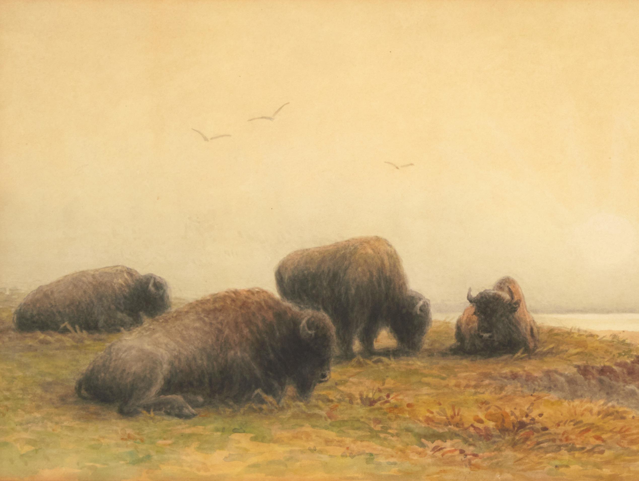 MISTY MORNING, 1881 watercolour on paper signed and dated lower right; titled to nameplate 11.5 x 25 in — 29.2 x 63.5 cm