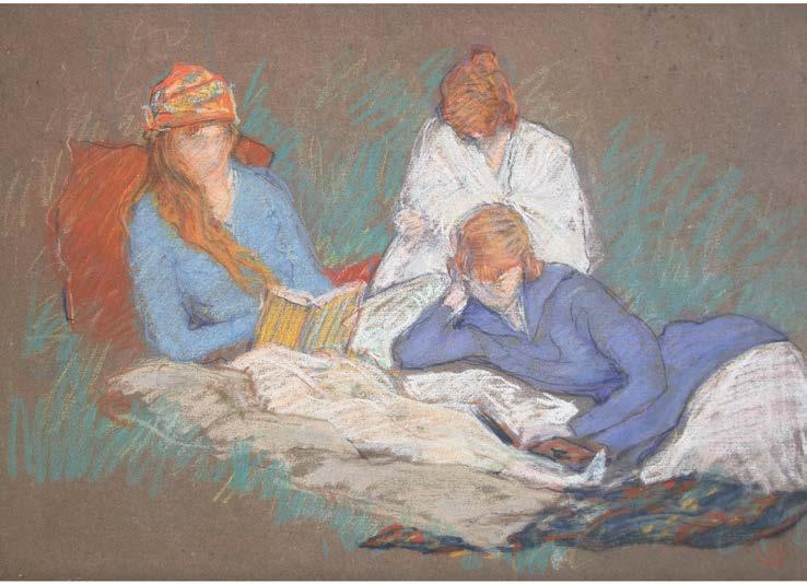 MISSES OLIVE AND EDNA PRETTY AND MRS. LUCILE GAGNON, STE-PÉTRONILLE, ILE D’ORLÉANS, 1919 graphite and pastel on paper stamped “Atelier Gagnon” lower right; titled and dated to gallery labels verso; certificate of authenticity signed verso 9 x 12.75 in — 22.9 x 32.4 cm