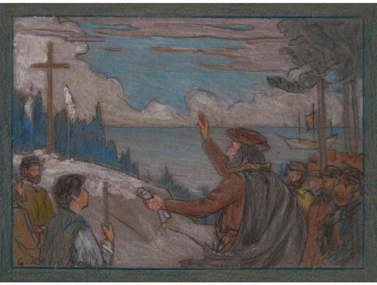 “CABOT RAISING THE FLAG ON THE COAST OF NEWFOUNDLAND 1497”, 1930 mixed media on paper signed and dated “30” lower left 12.5 x 9 in — 31.8 x 22.9 cm