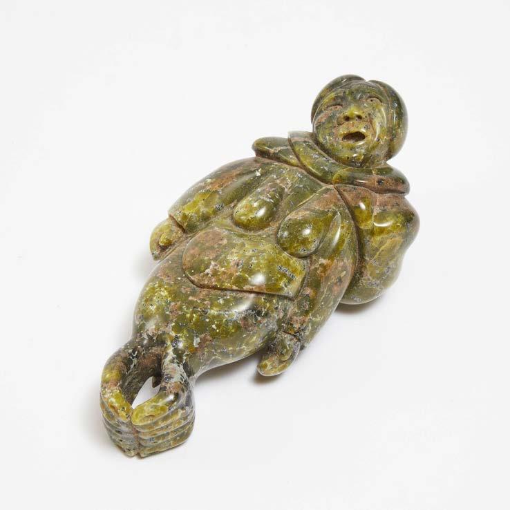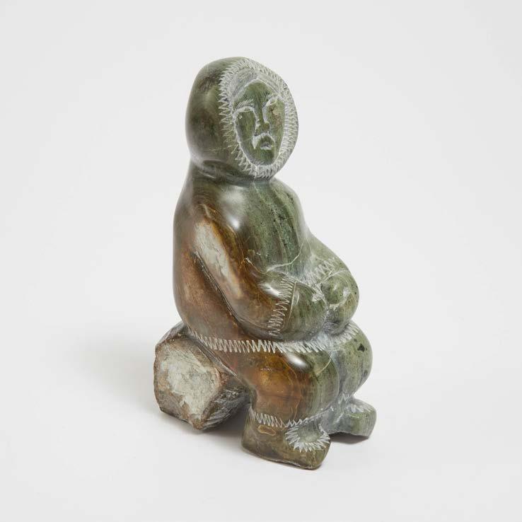 WOMAN WITH QULLIQ stone; signed in syllabics; disc number inscribed; accompanied by a “Canada Eskimo Art” tag inscribed “Eskimo woman and cooking bowl / Pangirtung / E6286 / Towkie Maniapik” 9.5 x 4.5 x 3.5 in — 24.1 x 11.4 x 8.9 cm
