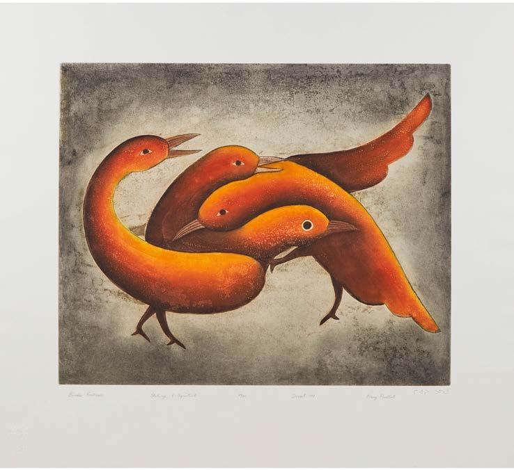 TALELAYOU, GIANT BIRDS AND MEN stonecut and stencil ; titled, dated, and numbered 13/50; artist’s name in Roman and syllabics sheet 24 x 33.5 in — 61 x 85.1 cm