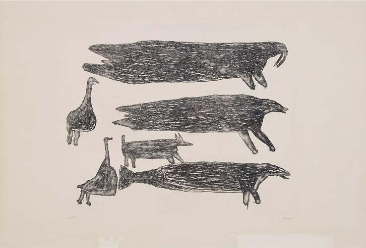 KIAKSHUK ᑭᐊᓱ (1886-1966), KINNGAIT (CAPE DORSET) UNTITLED (PEOPLE AND ANIMALS), 1962; UNTITLED (ANIMALS), 1962 engravings; numbered 27/50; artist’s name in Roman; numbered 33/50; artist’s name in Roman each sight 11.25 x 14.5 in — 28.6 x 36.8 cm