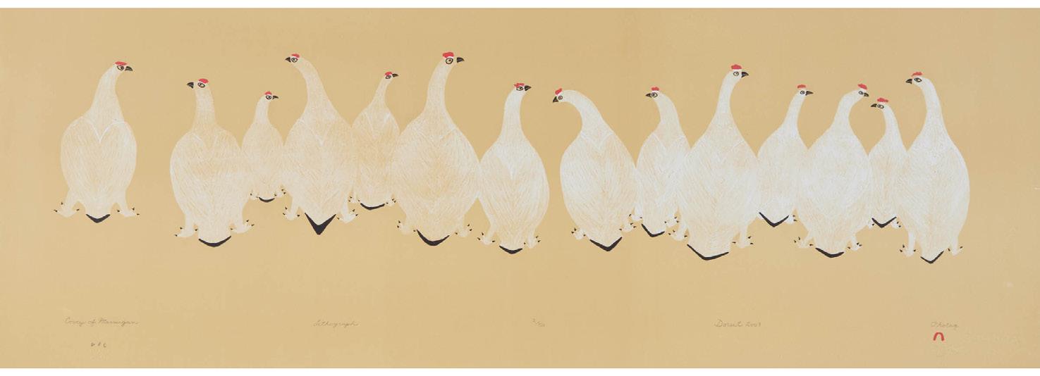 COVEY OF PTARMIGAN, 2007 lithograph; titled, dated, and numbered 2/50; artist’s name in Roman and syllabics sheet 14.75 x 42 in — 37.5 x 106.7 cm