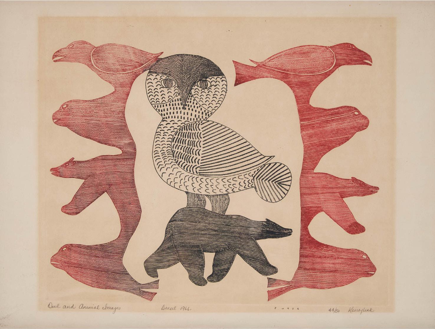 WINSOME OWL, 2013 etching and aquatint; titled, dated, and numbered 21/50; artist’s name in Roman and syllabics sheet 36 x 26 in — 91.4 x 66 cm