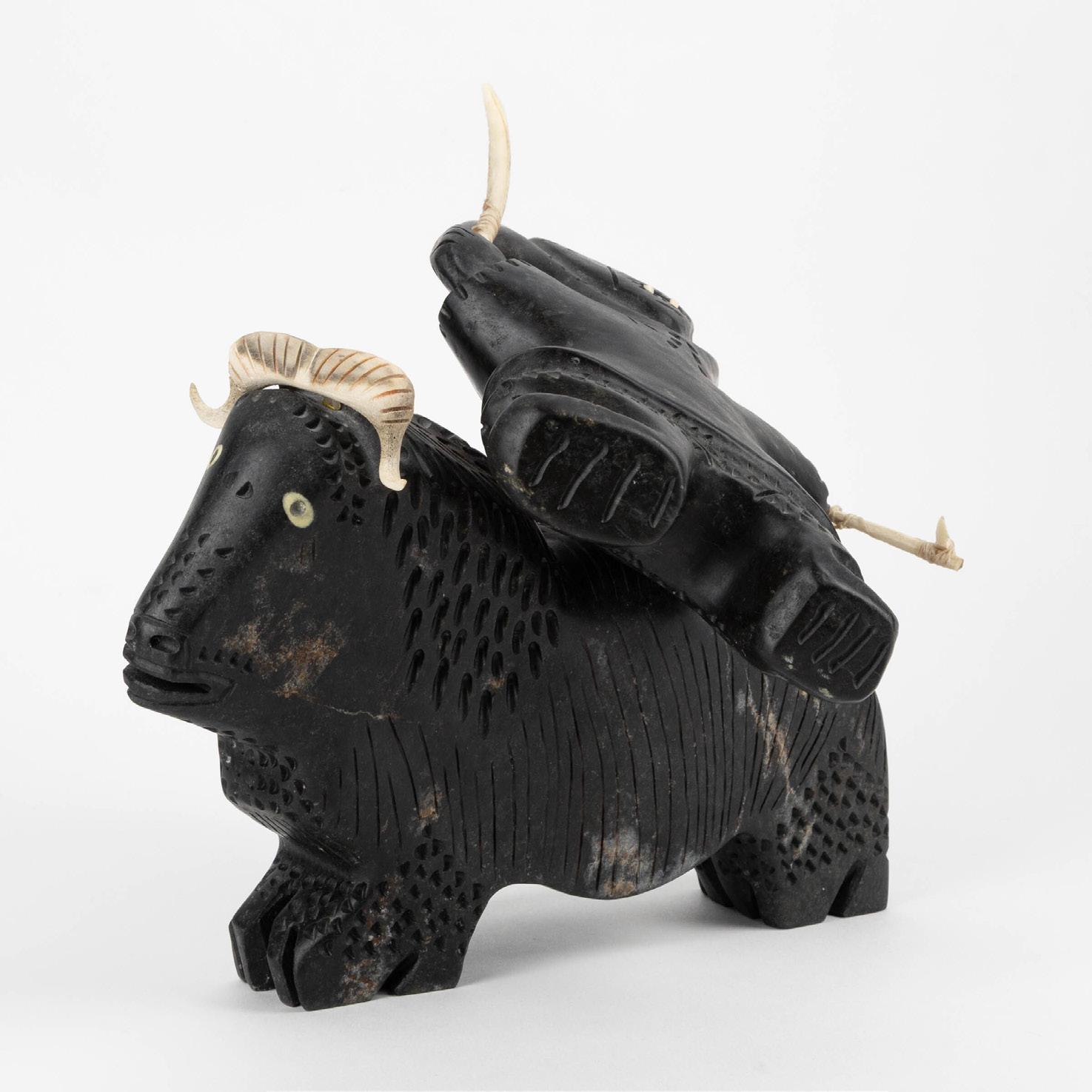 ANDY PALONGAYAK ᐸᓗᒐᔭ (B. 1946), UQSUQTUUQ (GJOA HAVEN) MUSK OX AND HUNTER, 2009 stone, antler, sinew; unsigned; accompanied by a “Canada Eskimo Art” tag inscribed “Andrew Palongayak / Gjoa Haven / Musk Ox and Hunter / 09210014”
