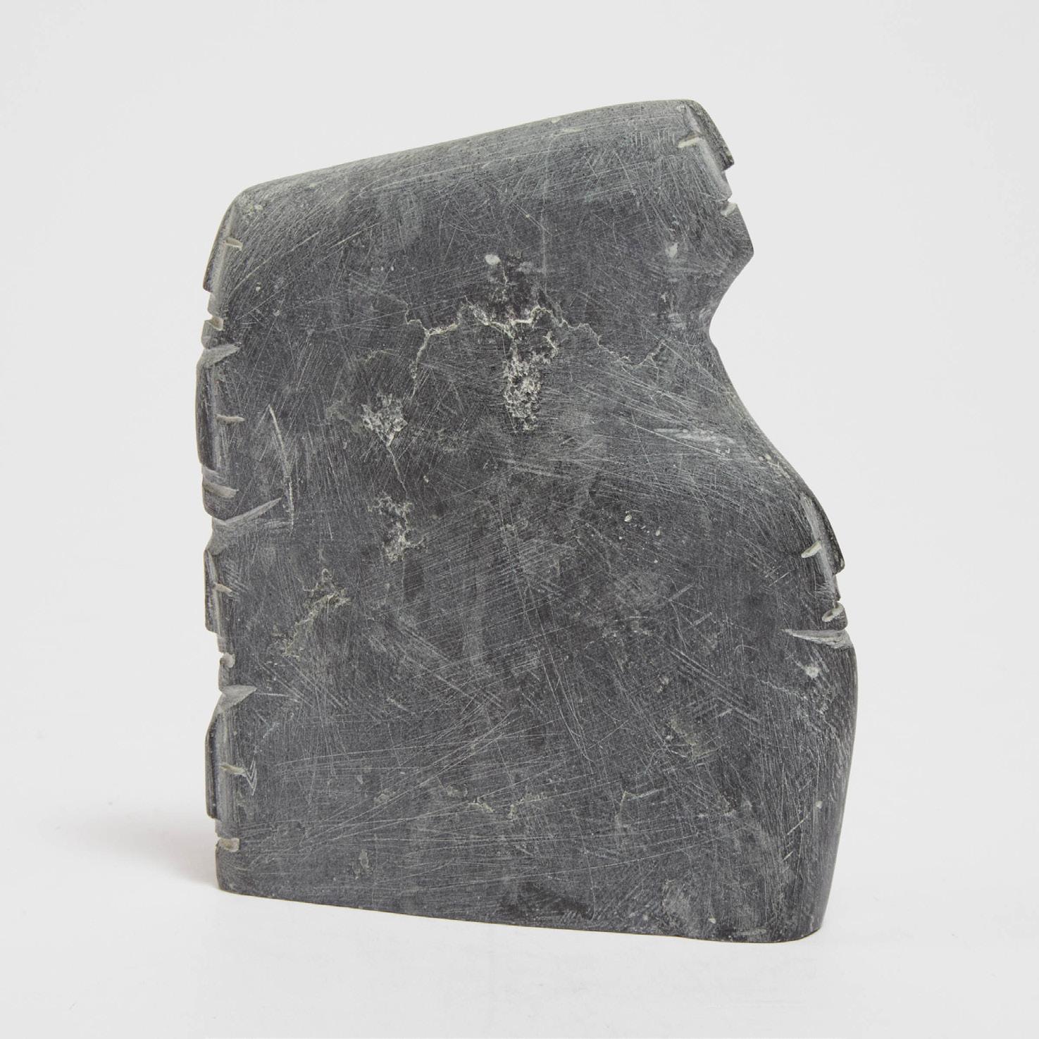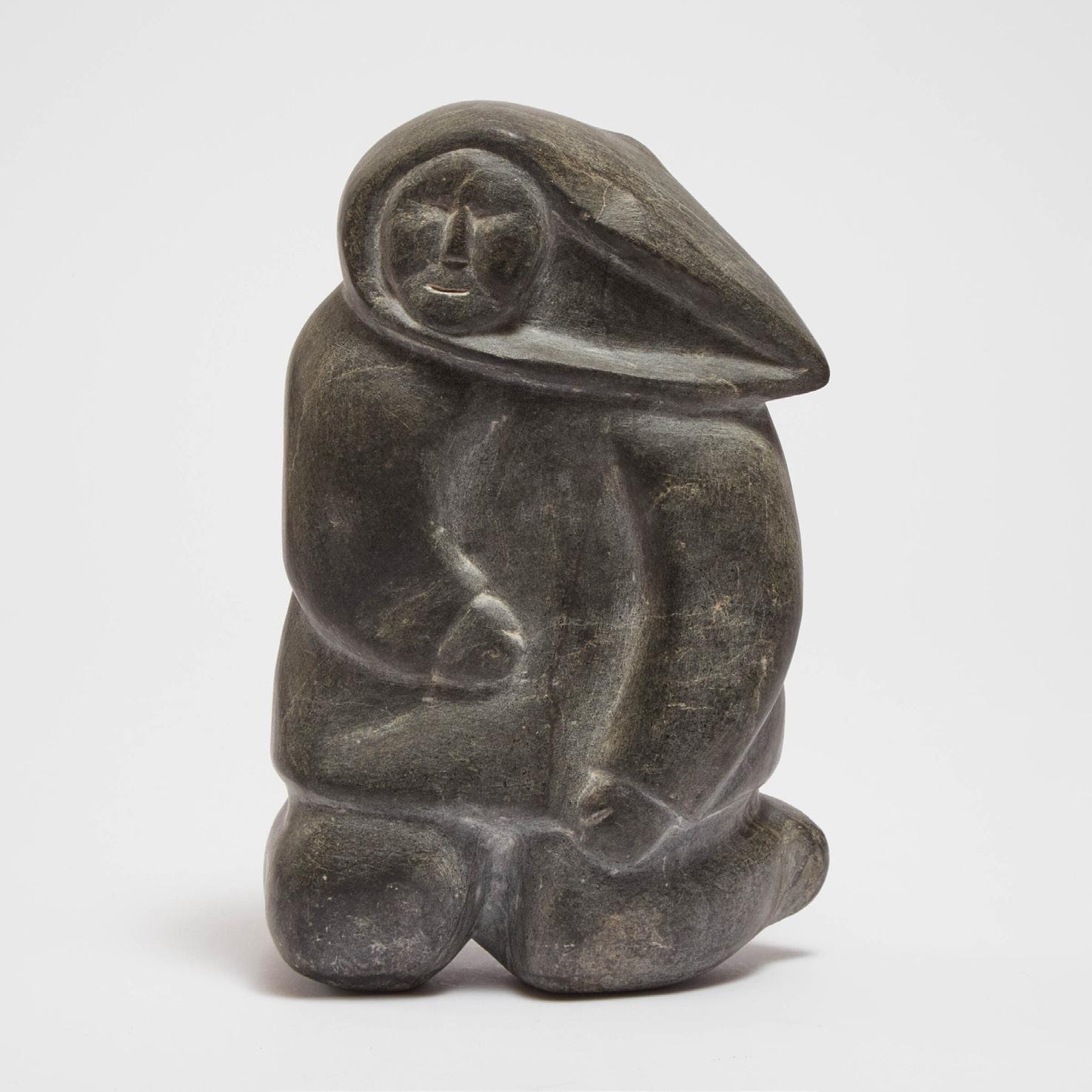 WOMAN WITH LONG HAIR stone; signed in syllabics; accompanied by a “Canada Eskimo Art” tag inscribed “Ovilu Tunnillie / Cape Dorset / D6433 / Woman with Long Hair”