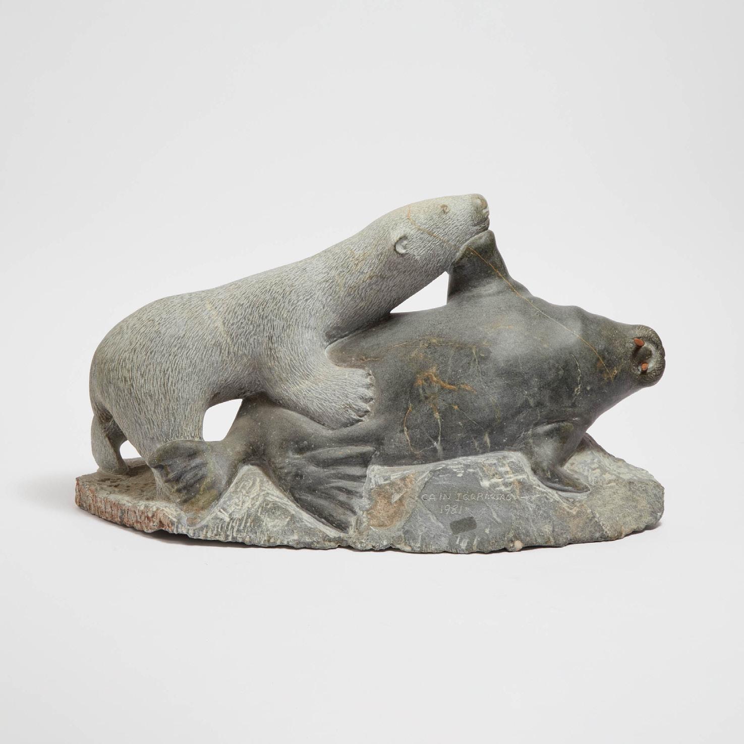 BEAR ATTACKING WALRUS, 1981 stone, wood; signed in Roman; dated 13.5 x 24 x 9 in — 34.3 x 61 x 22.9 cm