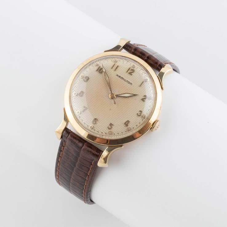 circa 1950’s; case #S278386; movement #CY185538; 34mm; 18 jewel cal.748 adjusted movement; textured dial; in a 10k yellow gold case with fancy lugs and a leather strap with a gold-plated buckle, working