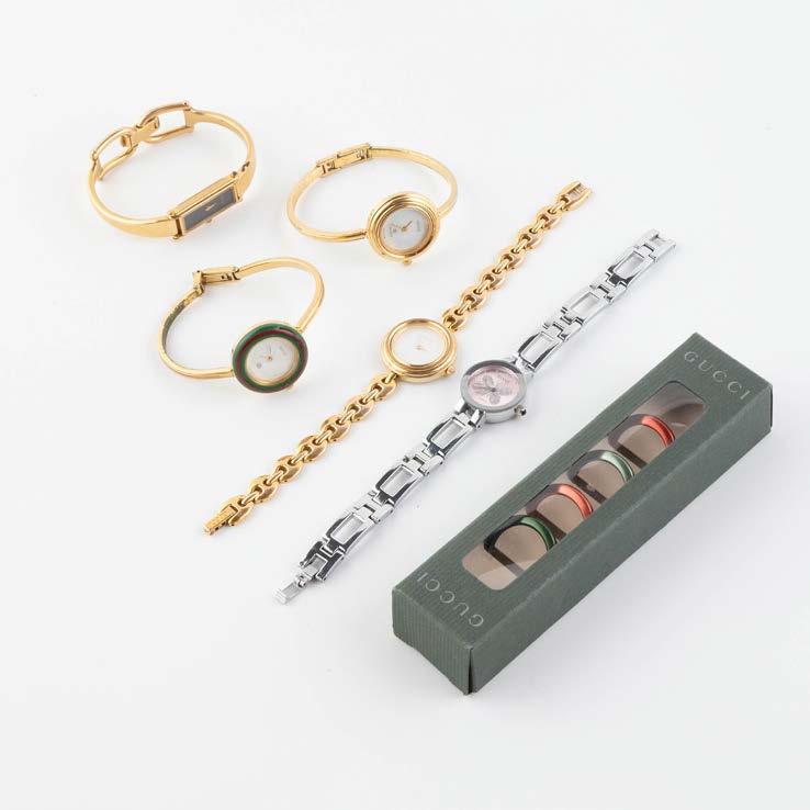 FIVE LADY’S GUCCI WRISTWATCHES circa 1990’s to 2000’s; quartz movements; in gold-tone and silver-tone metal cases and straps, together with a box of four extra bezels for the watches, all 5 not running