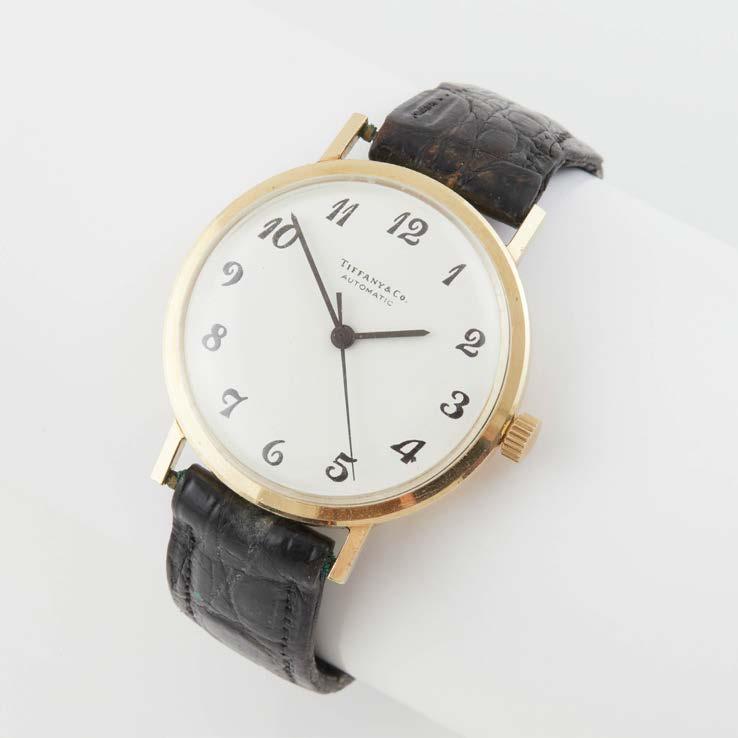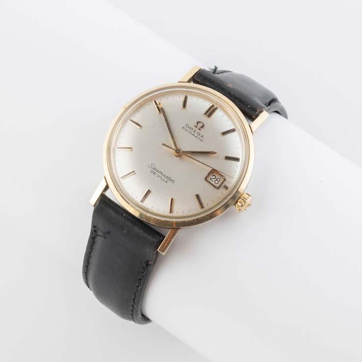 circa 1970; reference #T-100; case #6468963; 34mm; 17 jewel cal. automatic wind movement; in a 14k yellow gold case with a leather strap and a gold-plated Omega buckle, working; dial repainted; case and movement signed