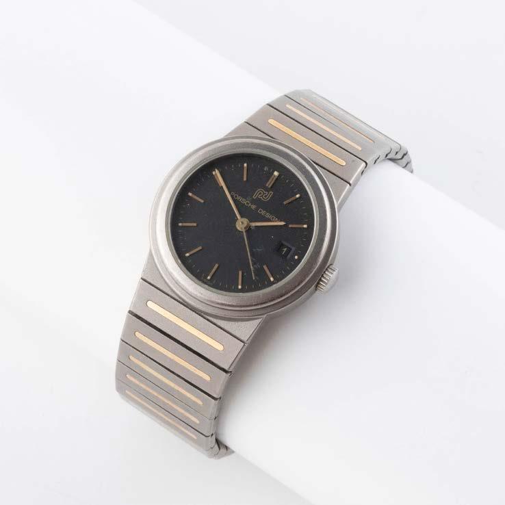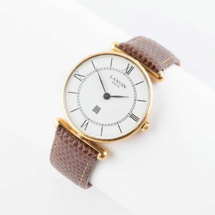 circa 1980’s; reference #XN50713; 20mm; quartz movement; plain black dial; in a gold-plated case and strap with threaded leather in the strap, working; gold-plating worn; issues with leather strapping