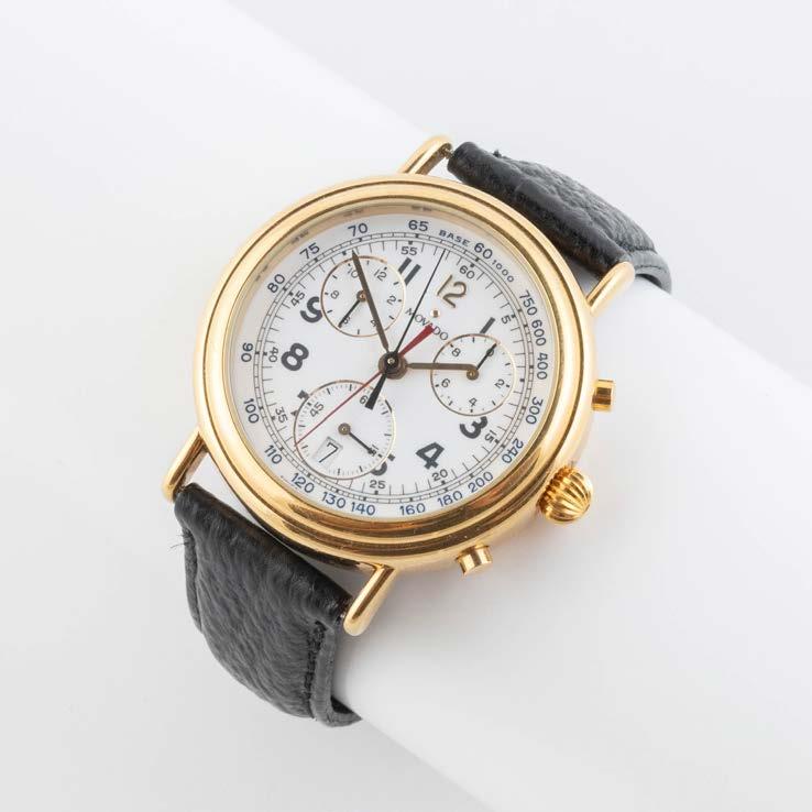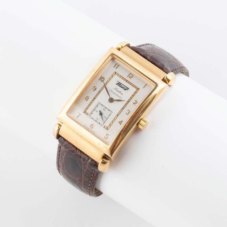 circa 2015; reference #MP6439; case #AI53540; 38mm; 25 jewel cal.ML37 automatic wind movement adjusted to 5 positions; white dial with day and month apertures and date pointer; in a tonneau-shaped stainless steel case with display back, 18k gold bezel, and a leather strap with a steel deployant buckle, working