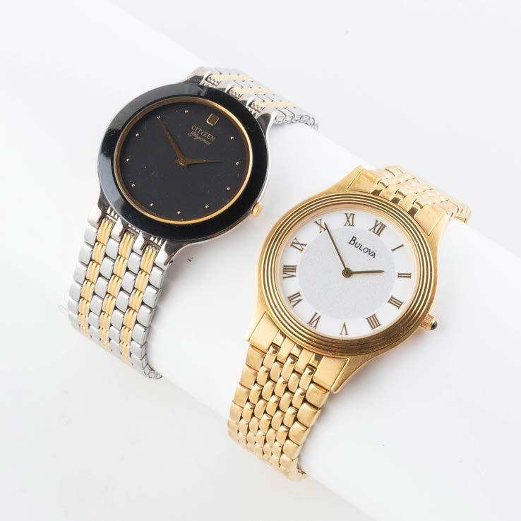 the first a Citizen ‘Elegance’, 33mm, with two-tone metal case and strap; the second a Bulova, 34mm, with gold-tone metal case and strap, both not running