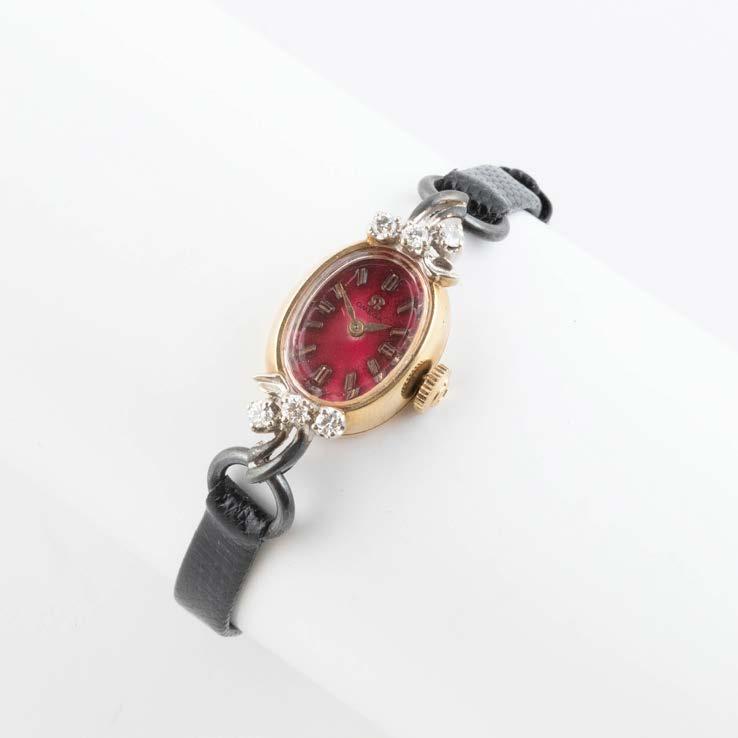 circa 1960’s; case #101242; 15mm; 17 jewel cal.482 movement adjusted to two positions; red enamel dial; in a 14 yellow and white gold case set with 6 brilliant cut diamonds (approx. 0.20ct.t.w.), with a leather strap and gold-plated buckle, not working