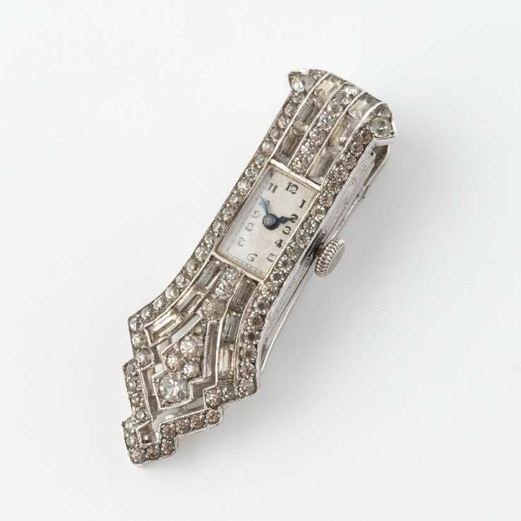 circa 1930’s; 14mm; 17 jewel cal.275 movement; in a 14k white gold case with an integral 14k white gold strap all set with 40 single cut and 16 brilliant cut (approx. 1.25ct.t.w) length 7.0 in — 17.8 cm, 23.1 grams, working; dial repainted